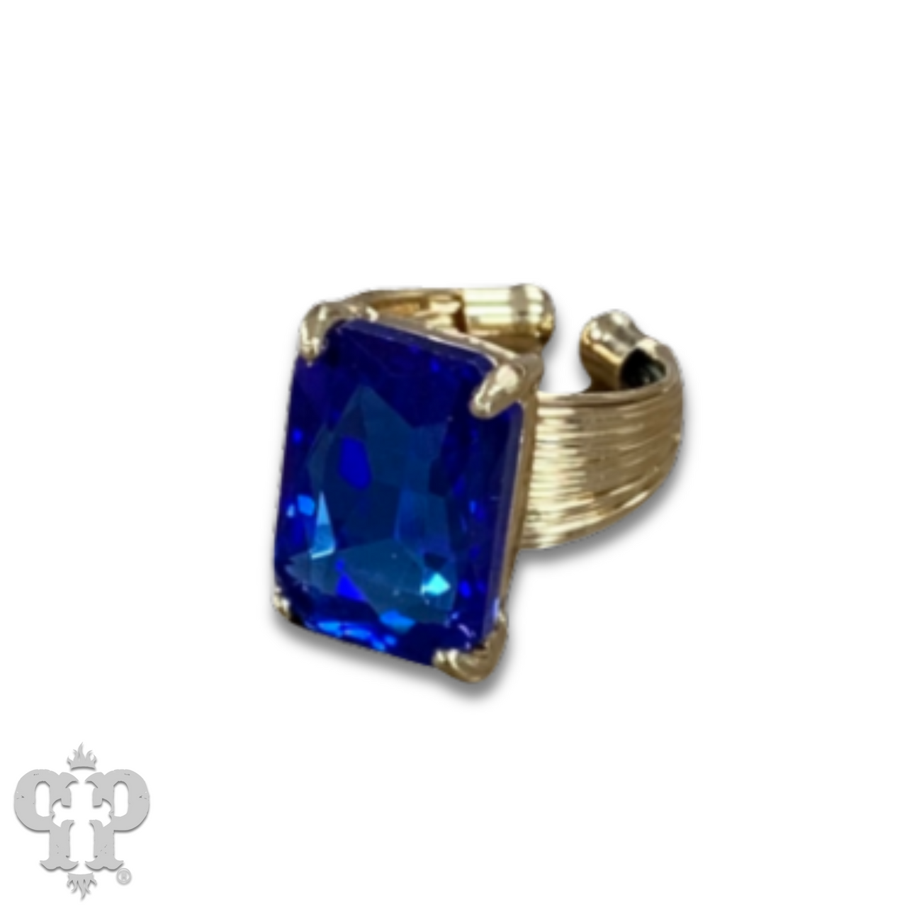 This adjustable ring base has a faceted rectangle rhinestone in a prong setting.