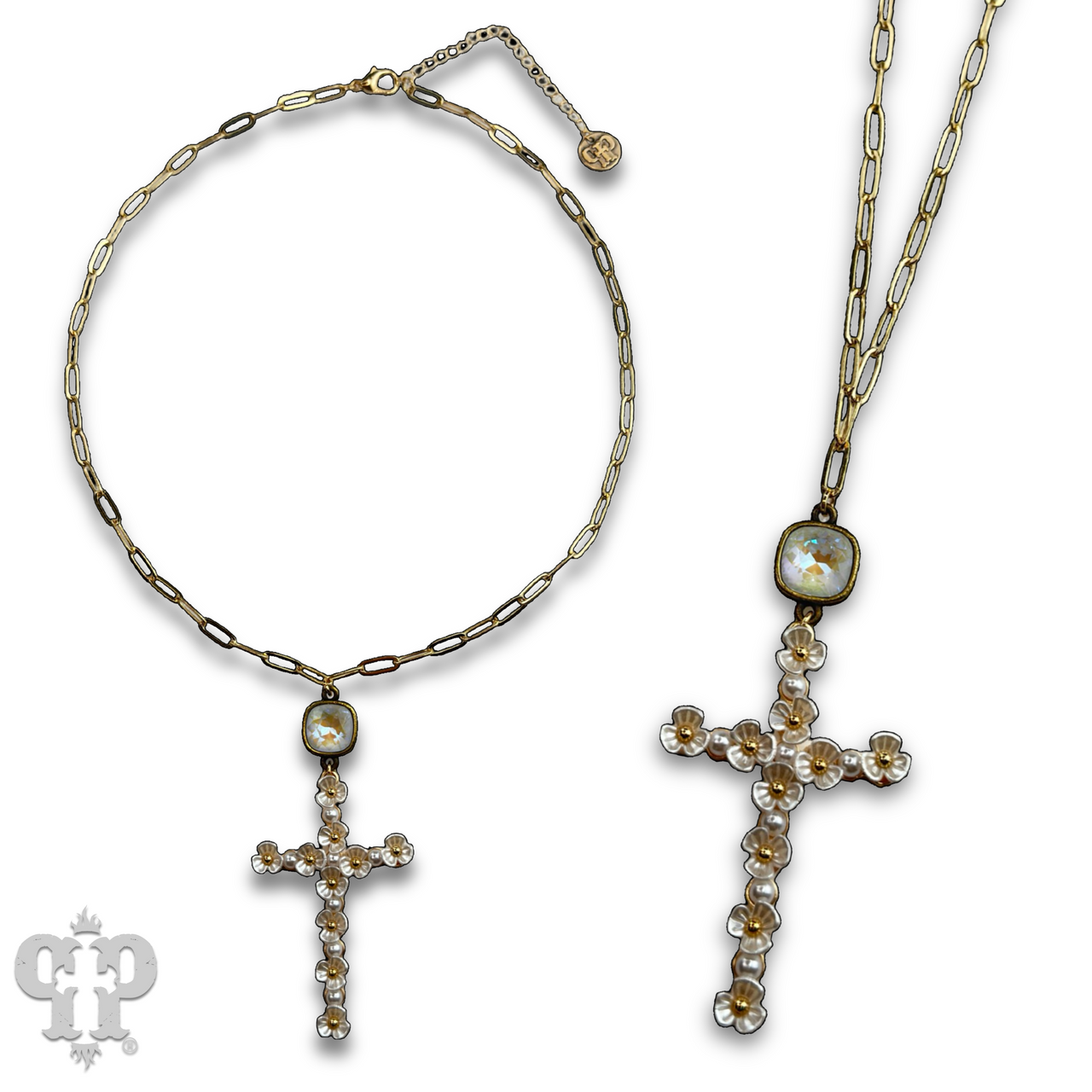 This necklace has gold tone paperclip chain with a pearlized white flower cross pendant. Connecting the pendant to the necklace is an Austrian crystal, in a setting custom made for Pink Panache in the USA.