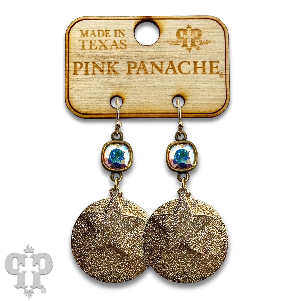 This earring has a gold tone disc and moveable star charm. It hangs from an 8mm iridescent (AB) Austrian crystal in a setting custom made for Pink Panache in the USA.