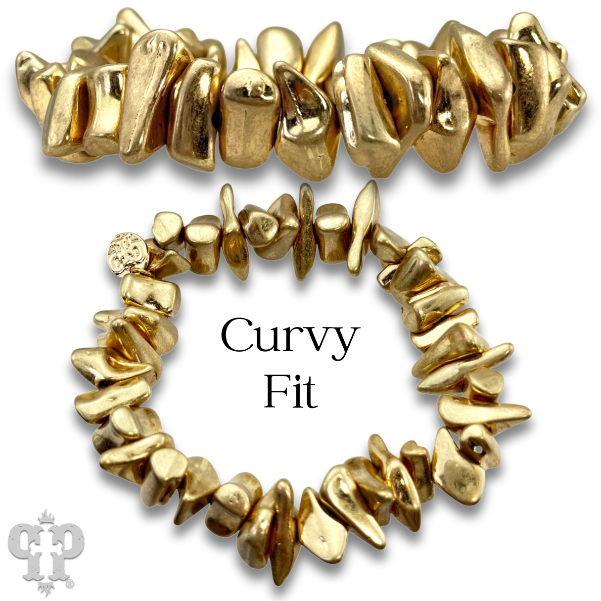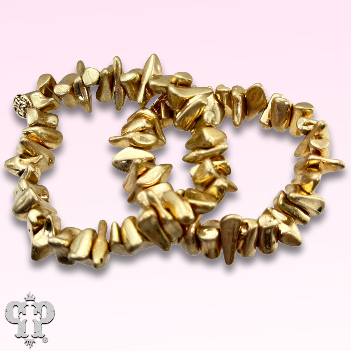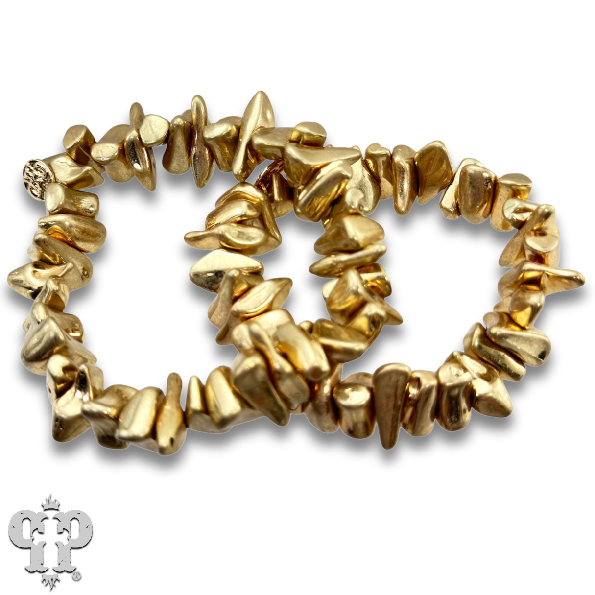 This single bracelet strand has gold tone nuggets for a chunky look.  It easily stretches on and off, making it a breeze to wear.
