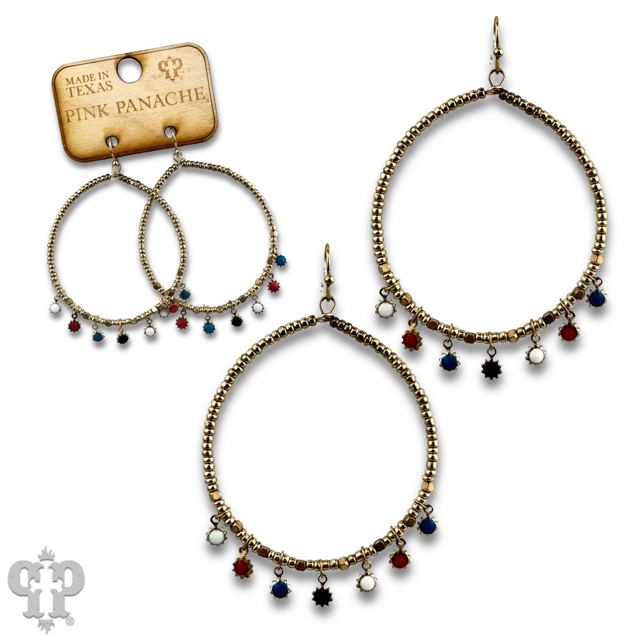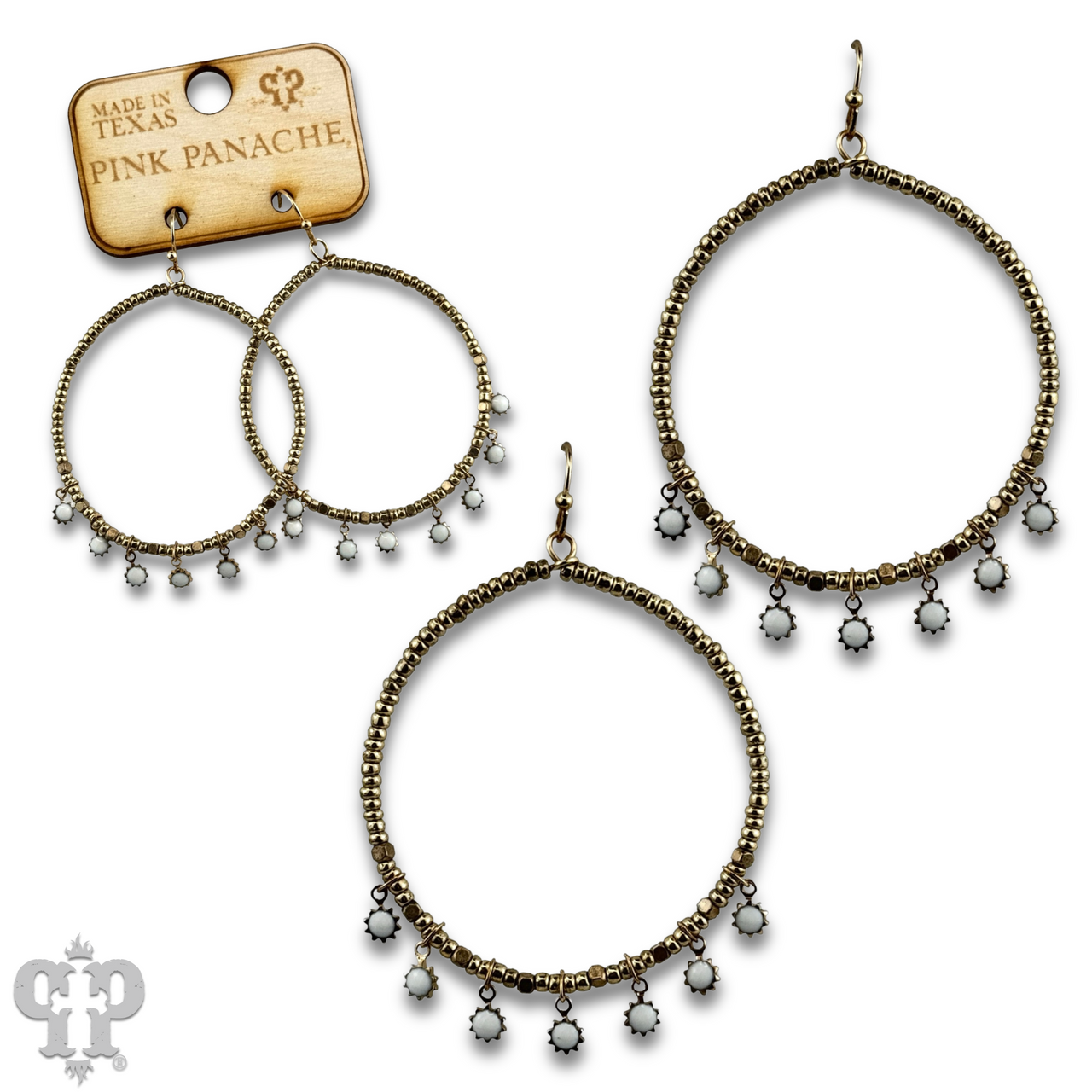 These circle shape earrings have tiny gold tone seed beads threaded onto it. At the bottom are seven little sunburst shape beads. They hang from a french hook.