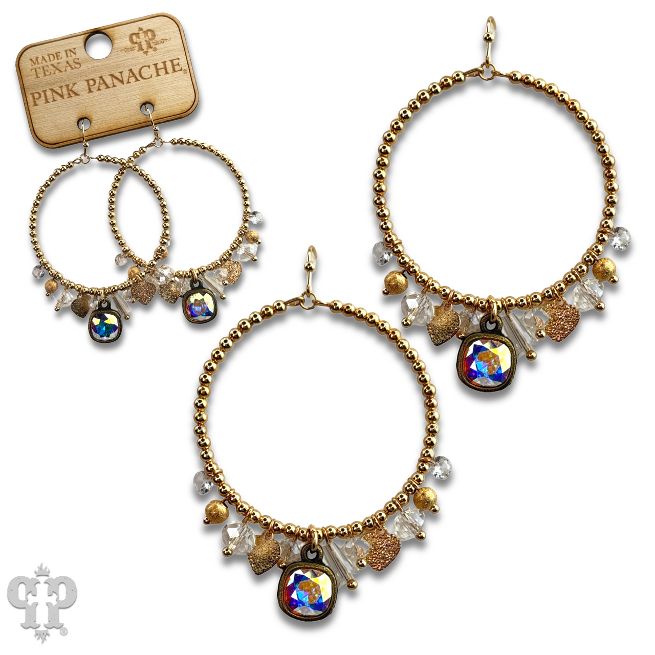 These circle shape earrings have metal tone round beads with tiny crystal and metal tone charms along the bottom. They have an Austrian crystal, in a setting custom made for Pink Panache in the USA, hanging from the bottom.