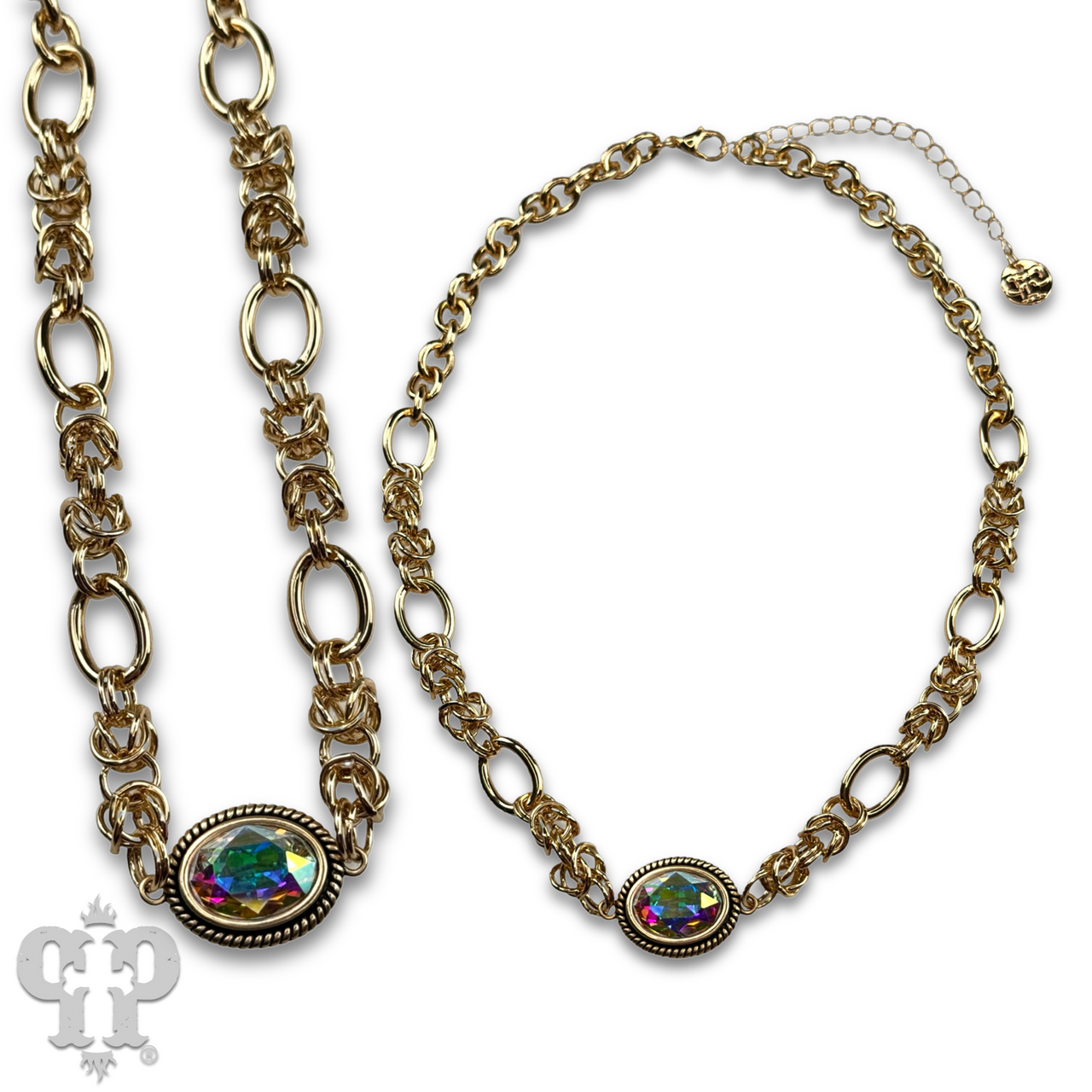 This chunky chain necklace boasts a beautiful sparkling crystal pendant in an oval shape. The crystal is in a custom logo setting. The chain has a variety of link styles and sizes.