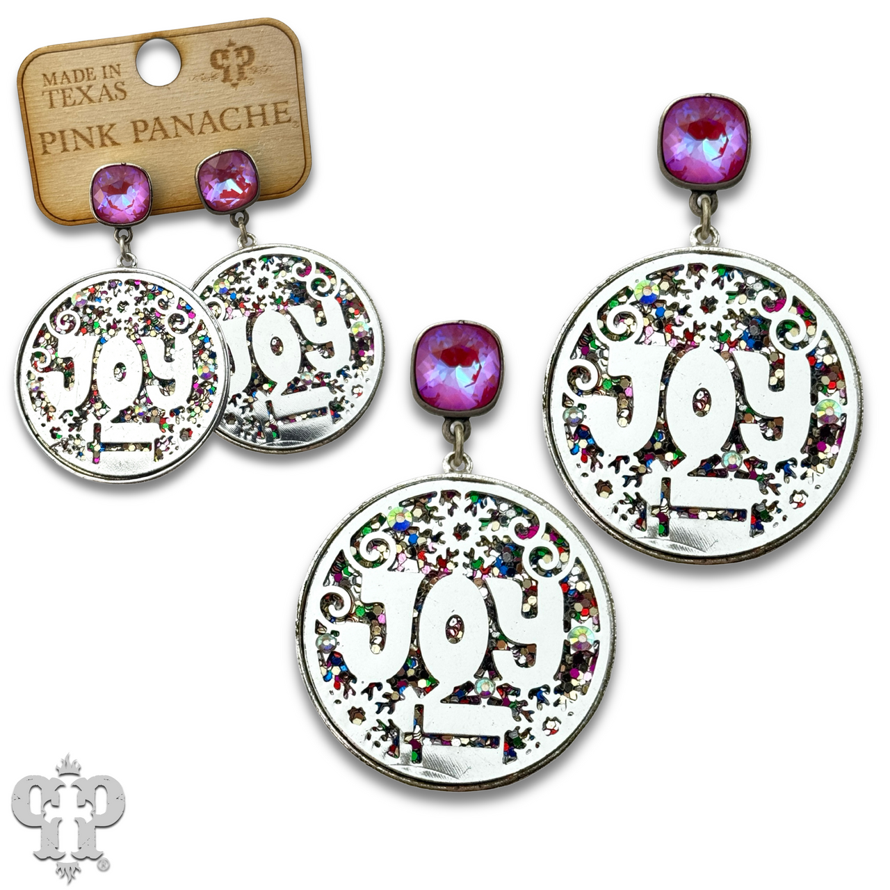 This earring has a laser overlay spelling out JOY with a glitter background. It hangs from an Austrian crystal in a setting custom made for Pink Panache in the USA.