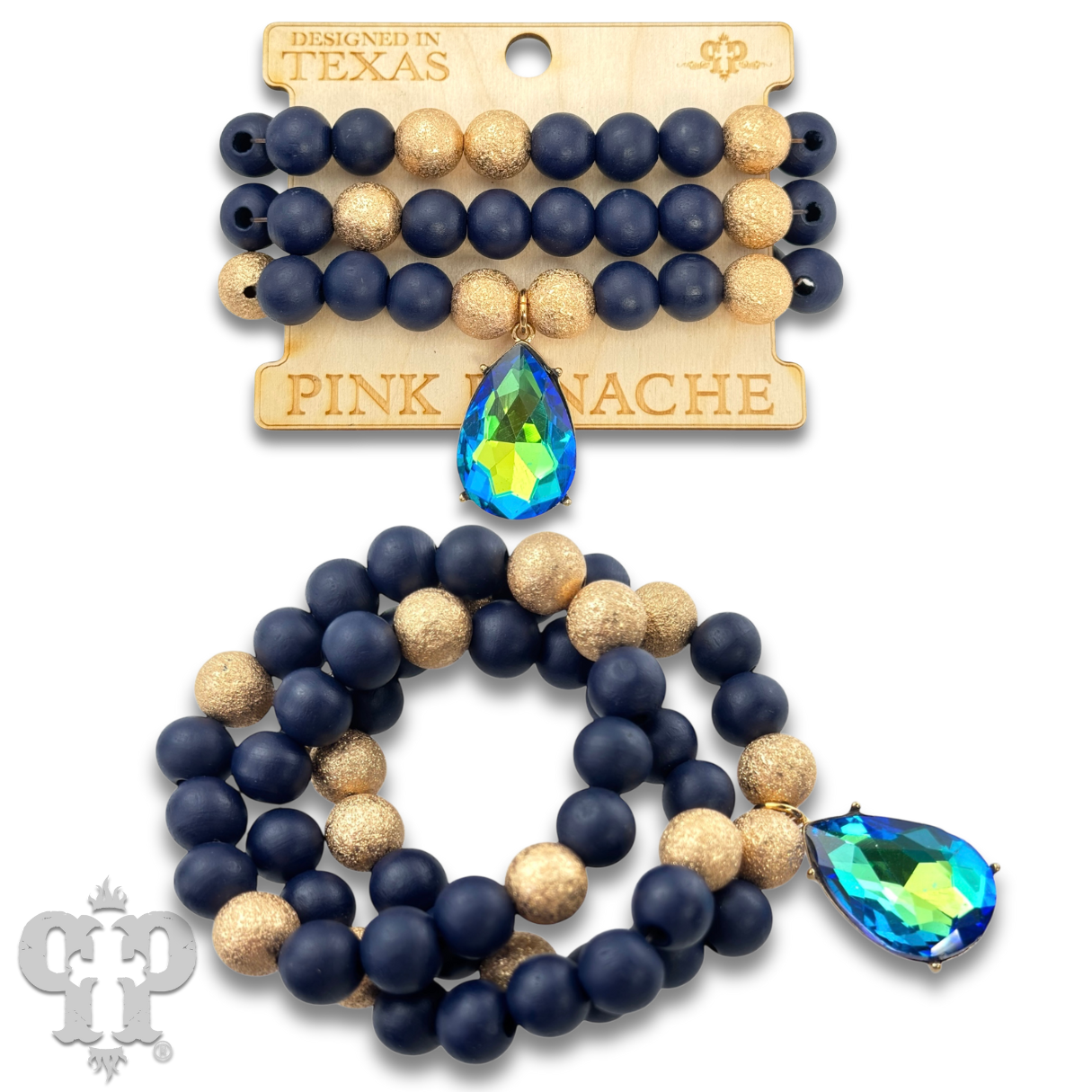 This bracelet boasts three strands of large round wood and gold tone foil texture beads. Adorned with a sparkling rhinestone teardrop charm, it easily stretches on and off for effortless style.