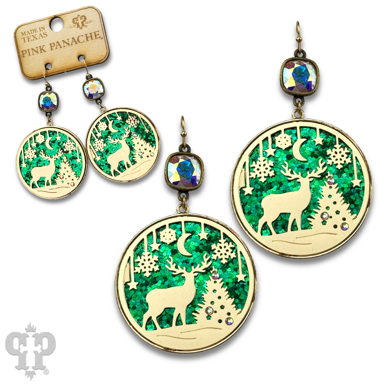 This earring has a Christmas scene with a glitter background. It hangs from an Austrian crystal in a setting custom made for Pink Panache in the USA.