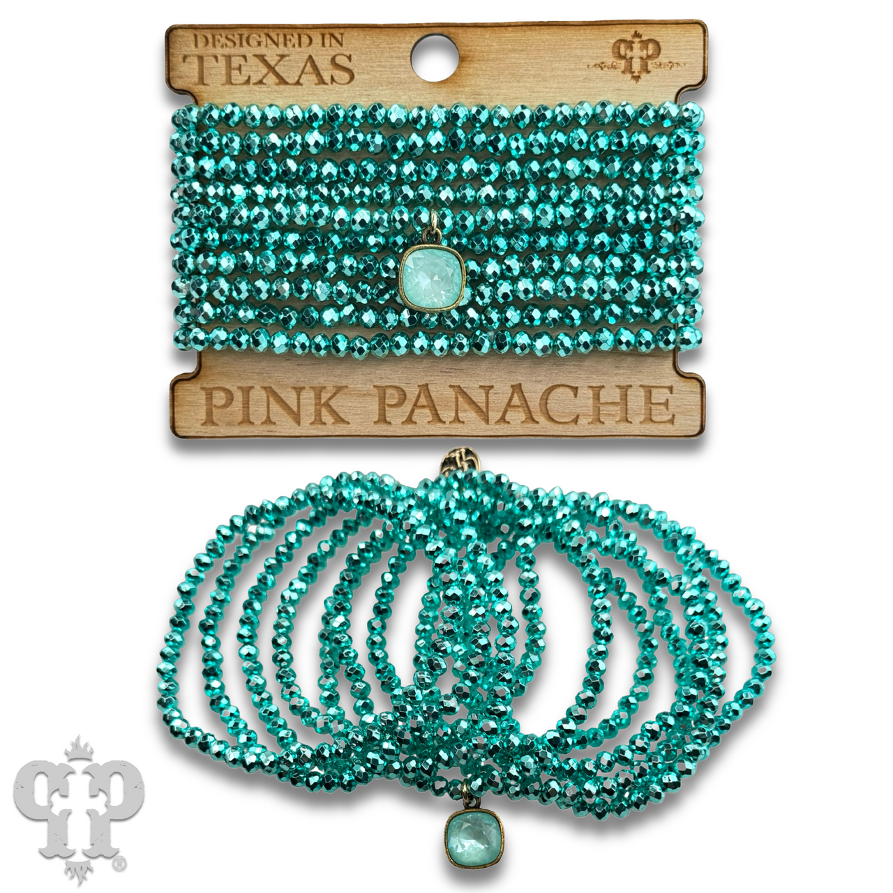 This bracelet set has 10 strands of faceted metallic finish beads. The charm is a 10mm Austrian crystal in a setting custom made for Pink Panache in the USA.
