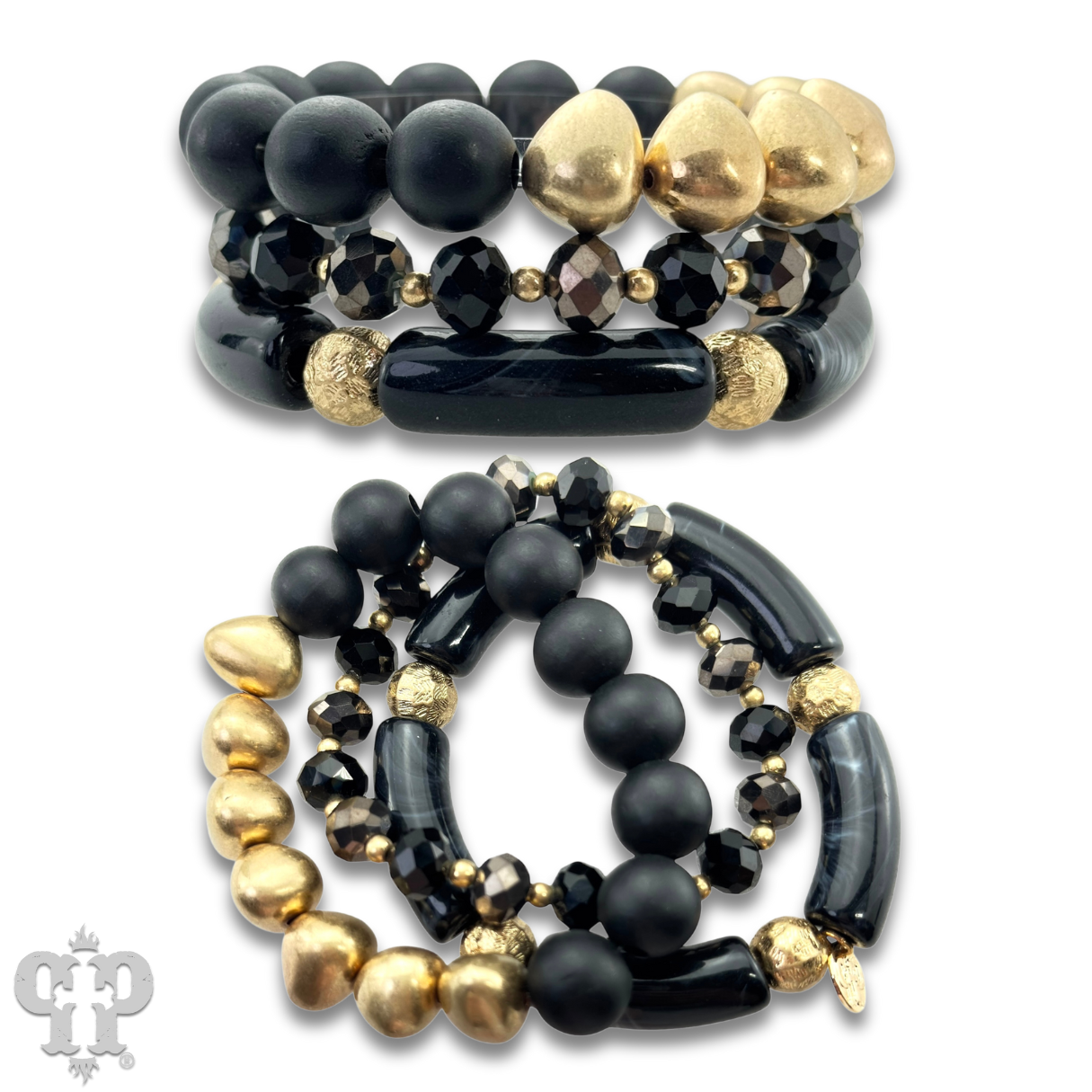 This bracelet set has three strands of chunky beads. The beads are different shapes and sizes. Stretches for easy on and off.