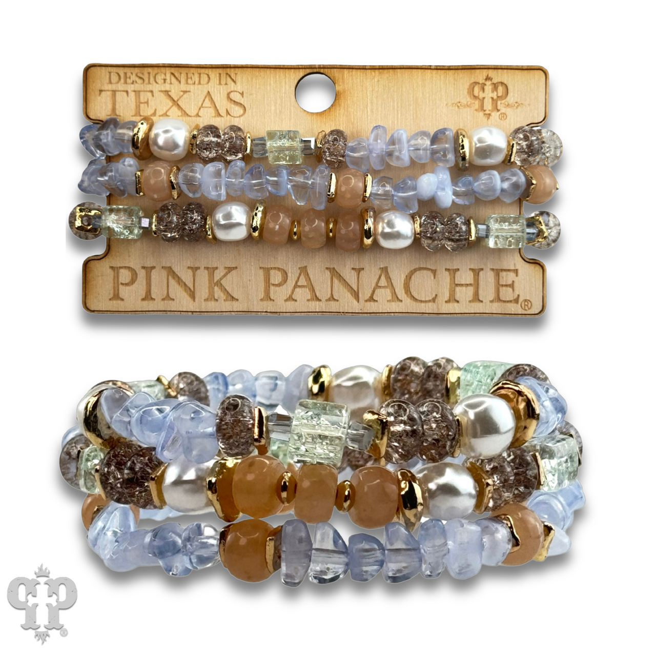 This bracelet set has a variety of bead styles such as crackle, stone chip and saucer beads. Included in the the three strands are acrylic pearls beads.
