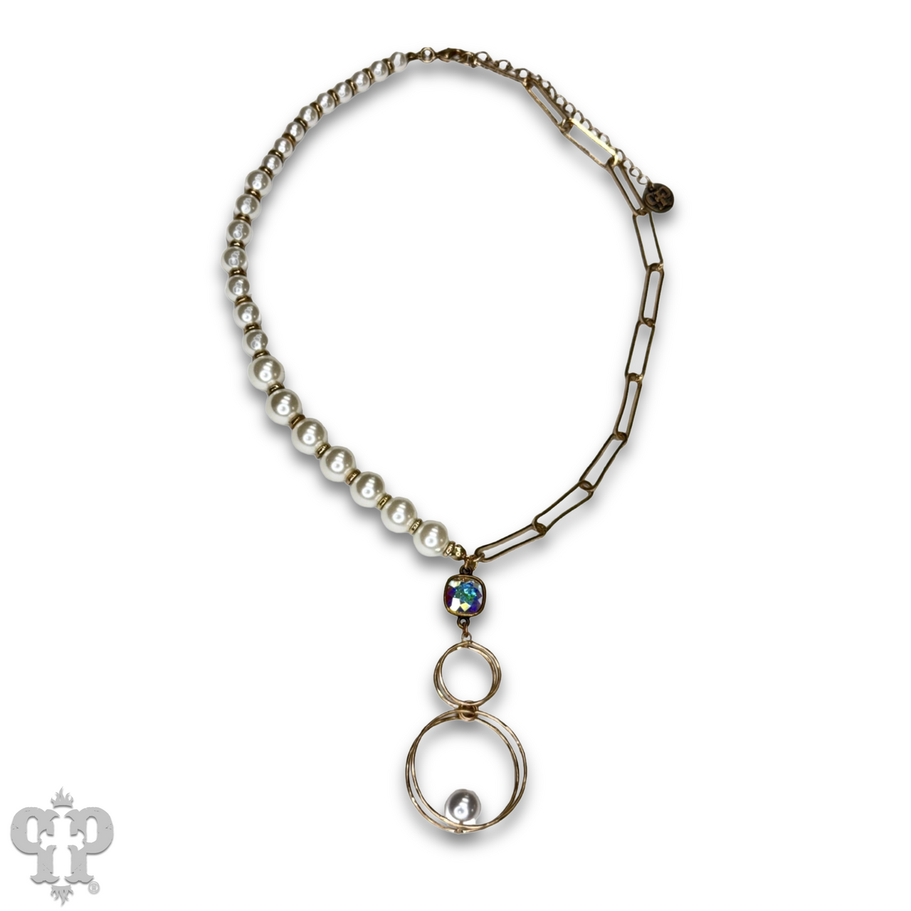 This necklace has pearl beads and paperclip chain and a double circle pendant with a floating pearl.