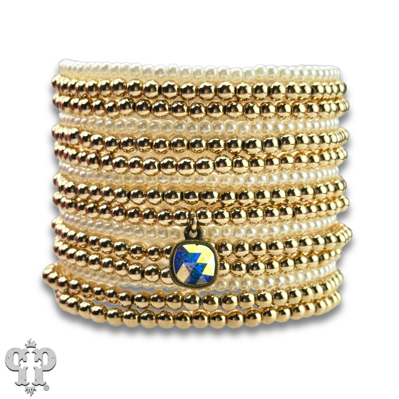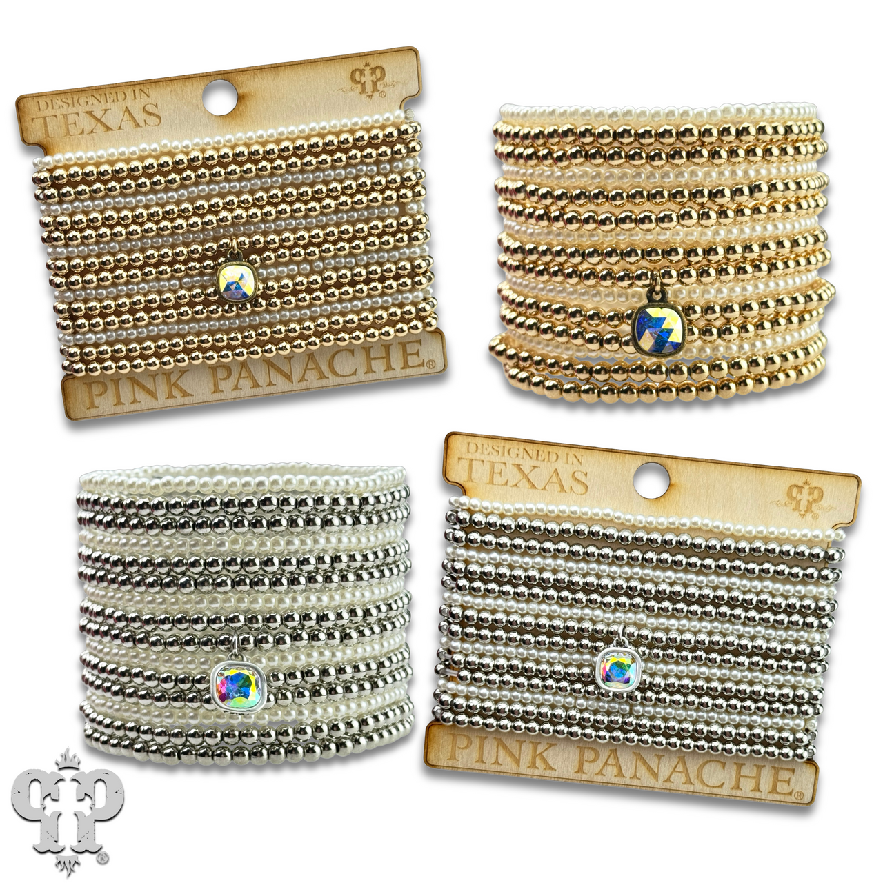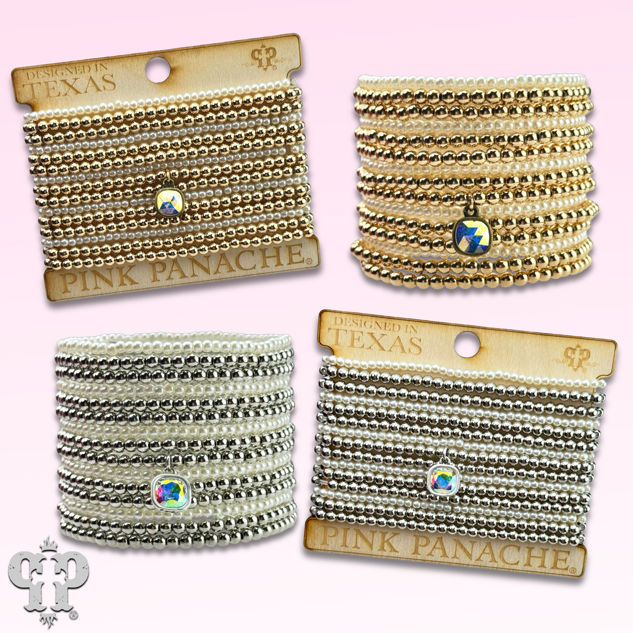 These bracelets have 15 strands of metal tone and pearl color beads.  The bracelet feature is an iridescent (AB) Austrian crystal in a setting custom made for Pink Panache in the USA.  The bracelet stretches for ease of wear.