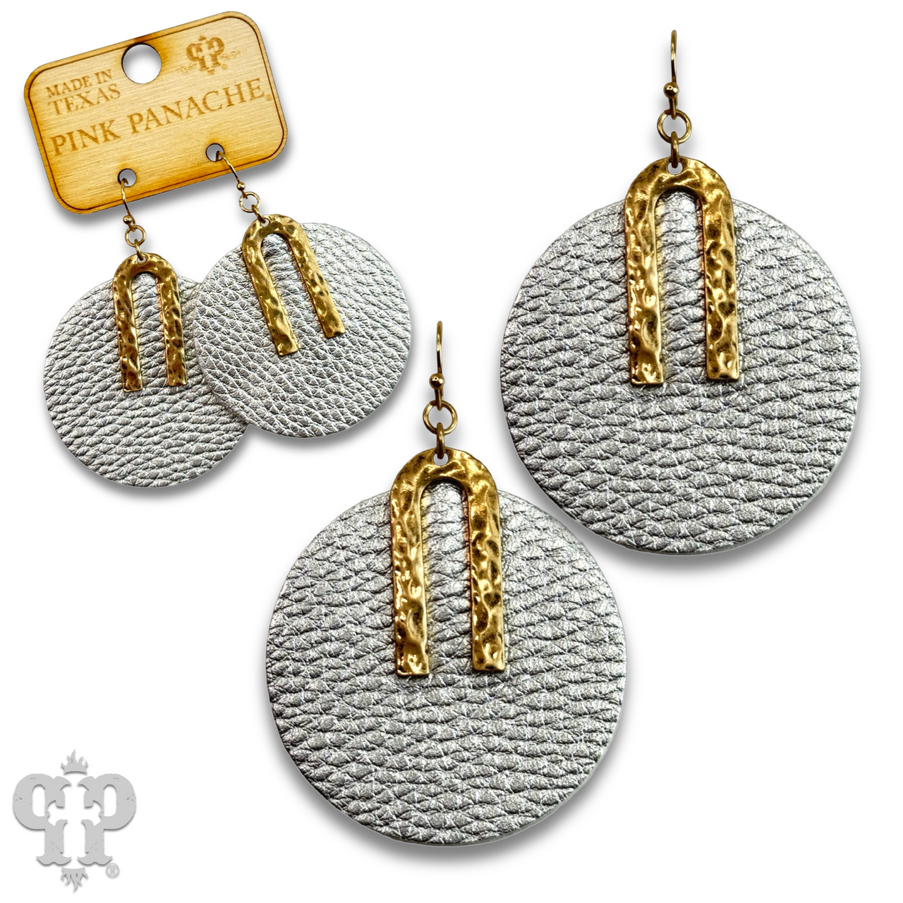 This earring has a pebbled leather circle with gold tone arch decoration. It hangs from a french hook. Light weight but substantial looking.