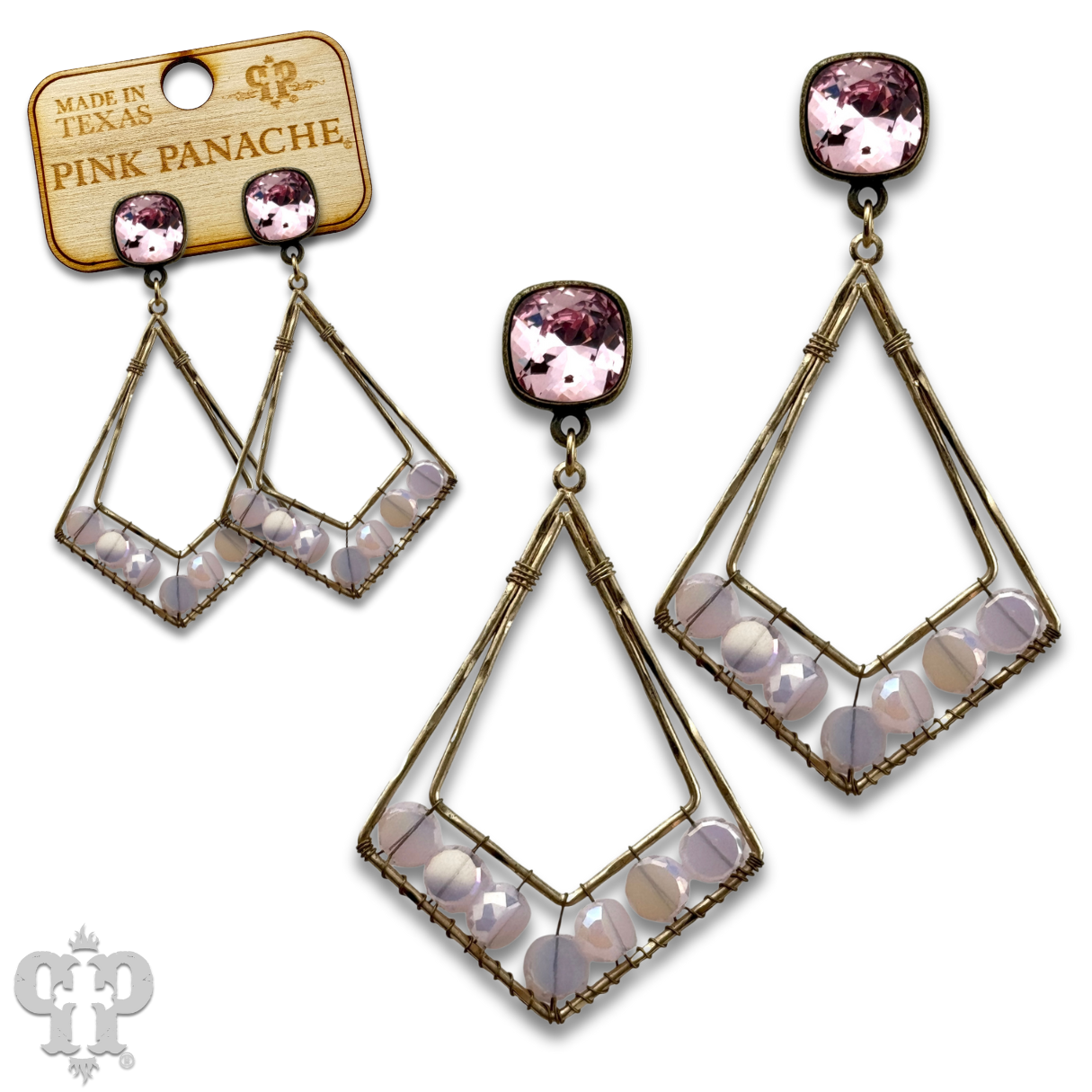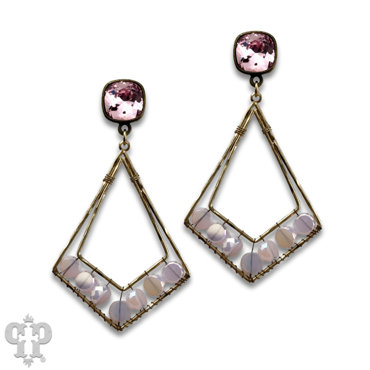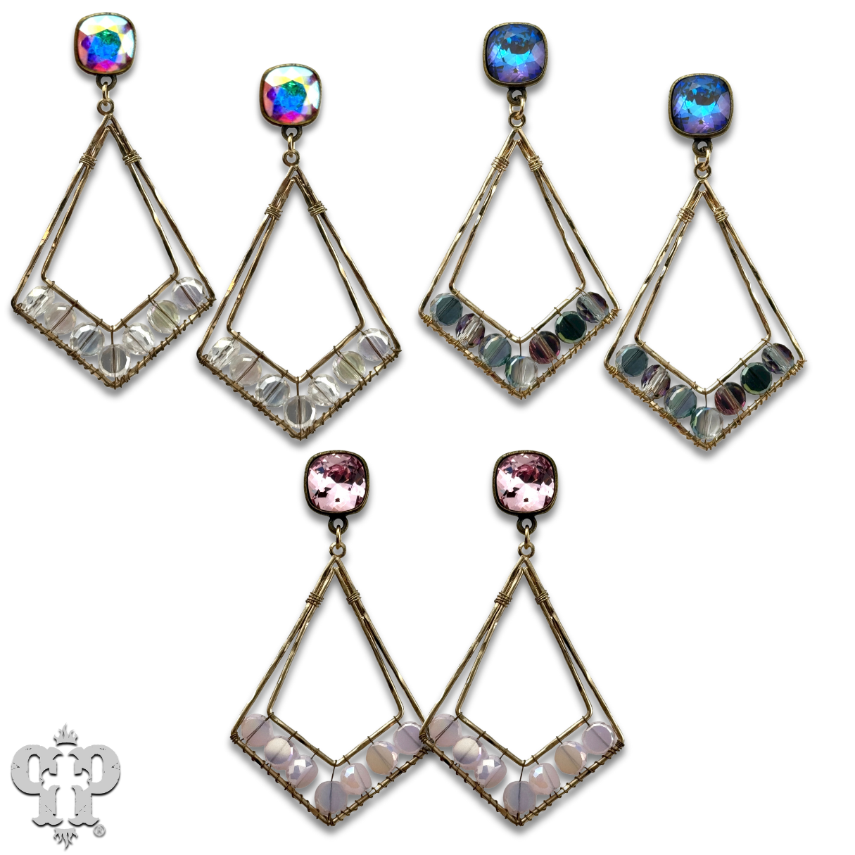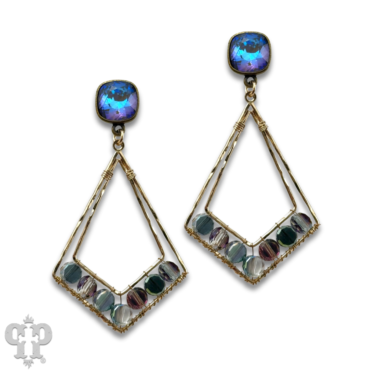 This earring has a gold tone pointed teardrop with coin beads wire wrapped around the bottom.  It hangs from a 10mm Austrian crystal post back setting custom made for Pink Panache in the USA.