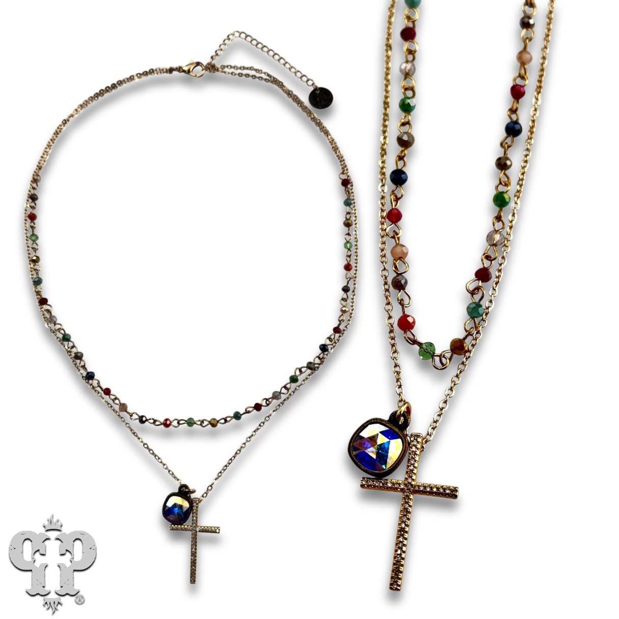 This two strand necklace has one of chain and one of multi-color beads. The pendant is a gold tone, pave rhinestone, cross. It is enhanced with the sparkle of an iridescent (AB) Austrian crystal in a setting that was custom made for Pink Panache in the USA.