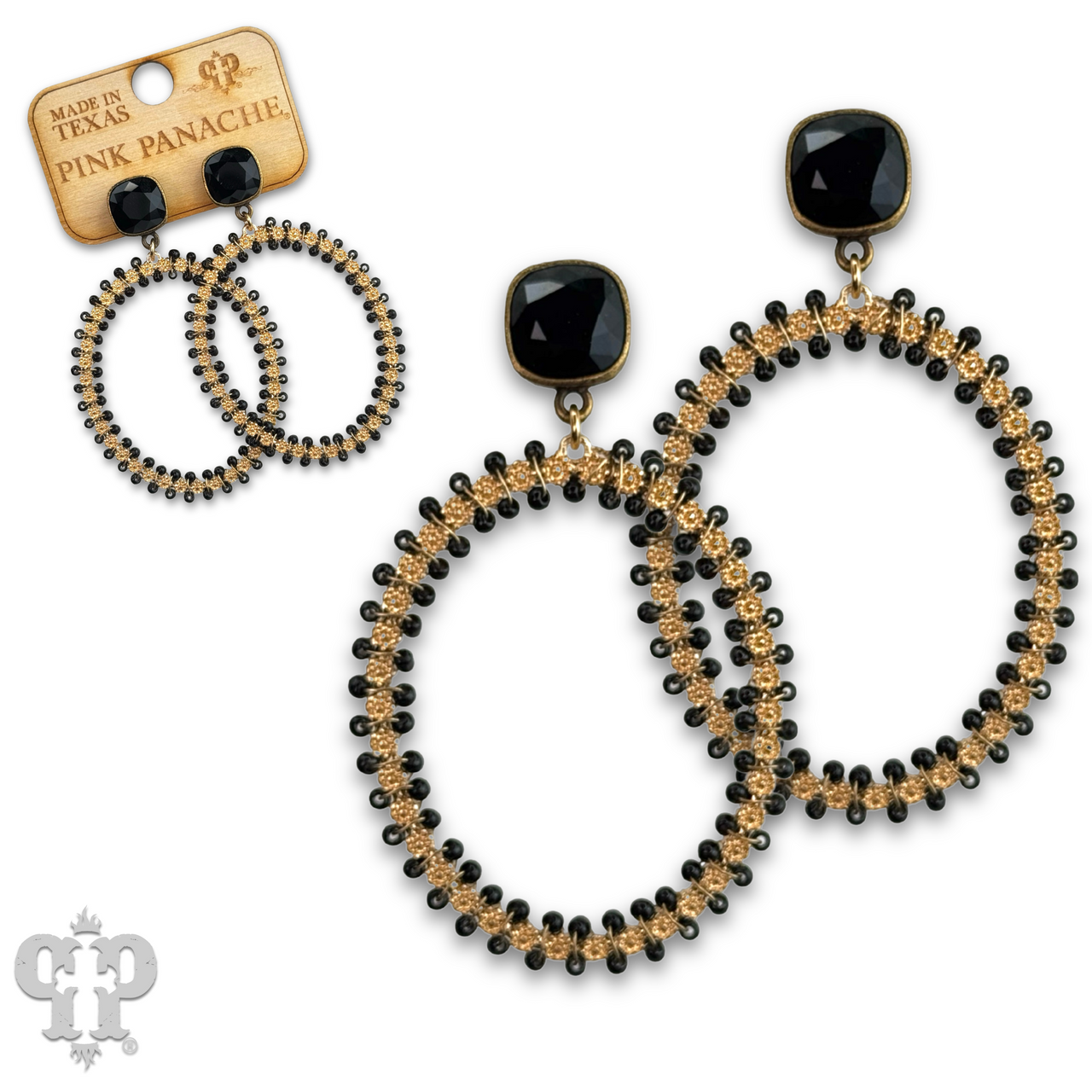 These earrings have a flower embossed gold tone oval with seed beads wire wrapped around it. They hang from an Austrian crystal in a setting custom made for Pink Panache in the USA.