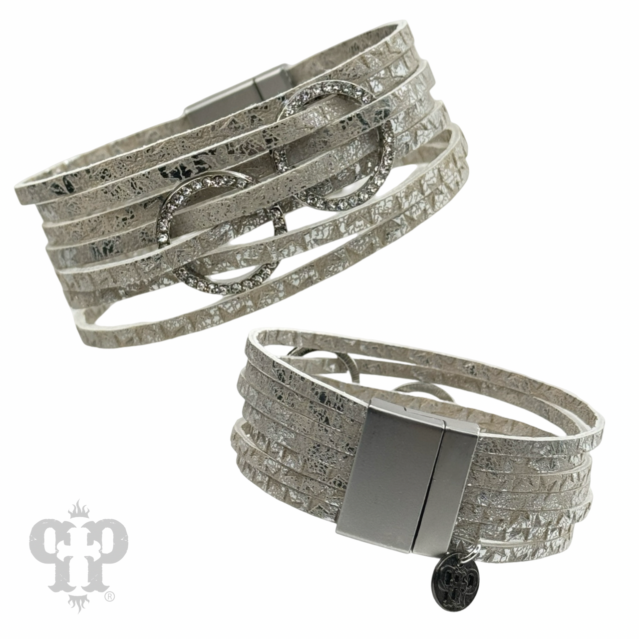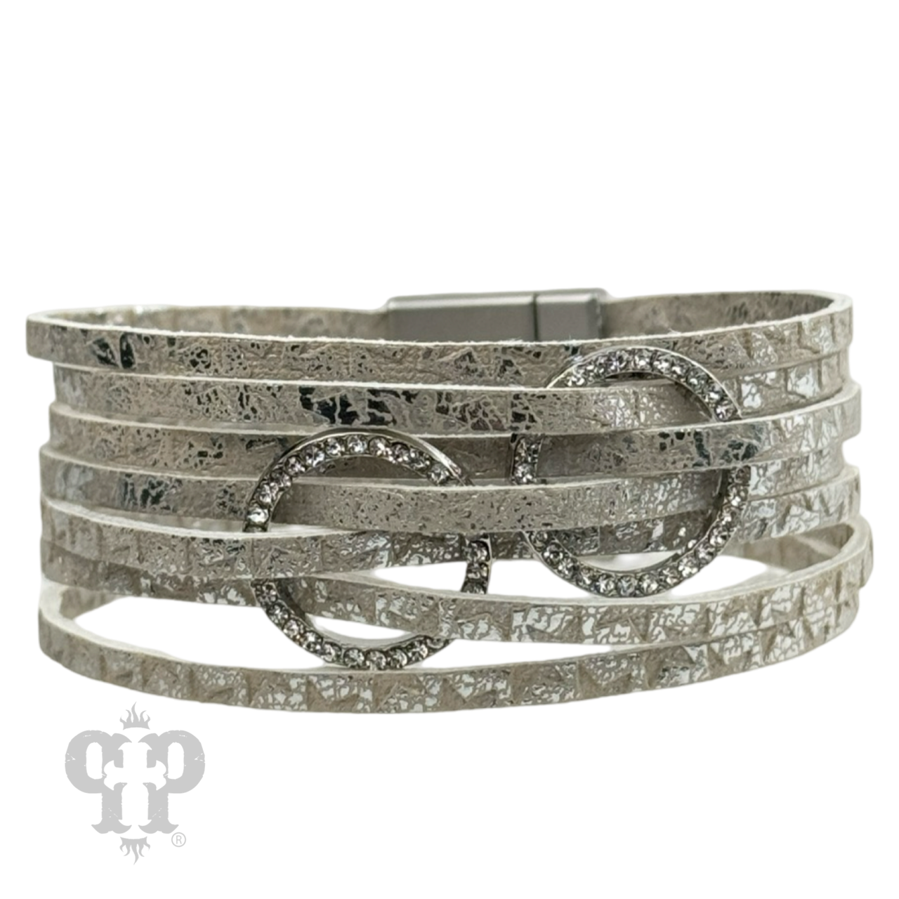 This star embossed multi-strand leather cuff bracelet features two clear rhinestone circles and a magnetic clasp.