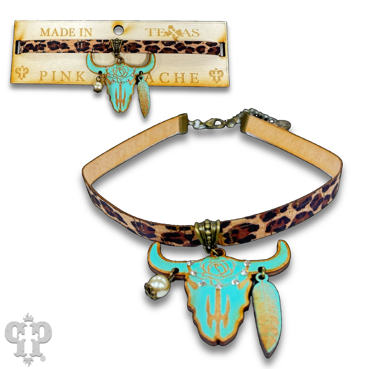 This leopard print choker has a laser engraved wood steer or cow skull charm with handset Austrian crystals. It has a champagne color pearl bead and laser engraved feather charm. The choker is laser cut leopard print cork.