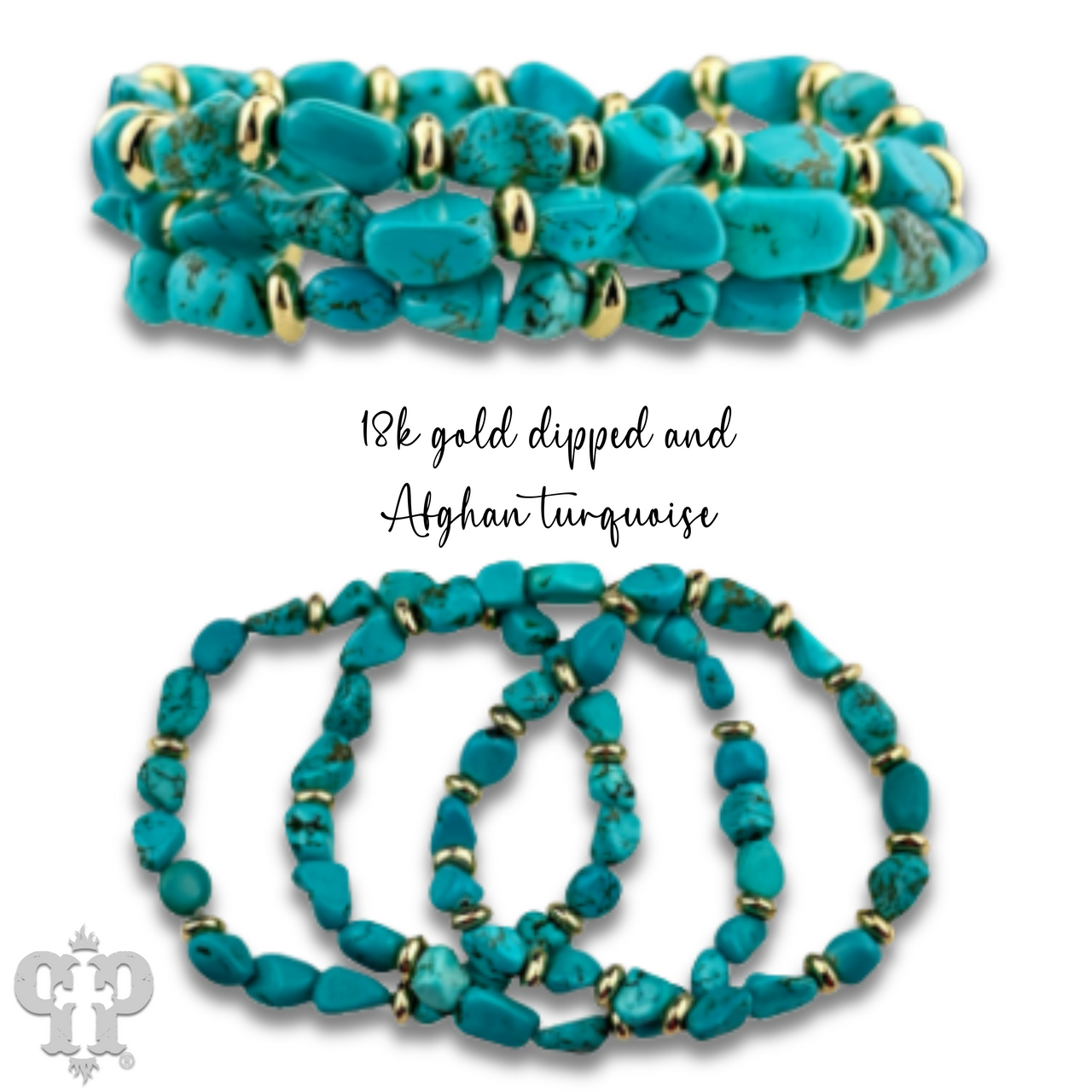 This bracelet set has three strands of Turquoise and 18k gold dipped saucer beads. The set can be layered with other pieces or worn on its own. It stretches for ease of wear.