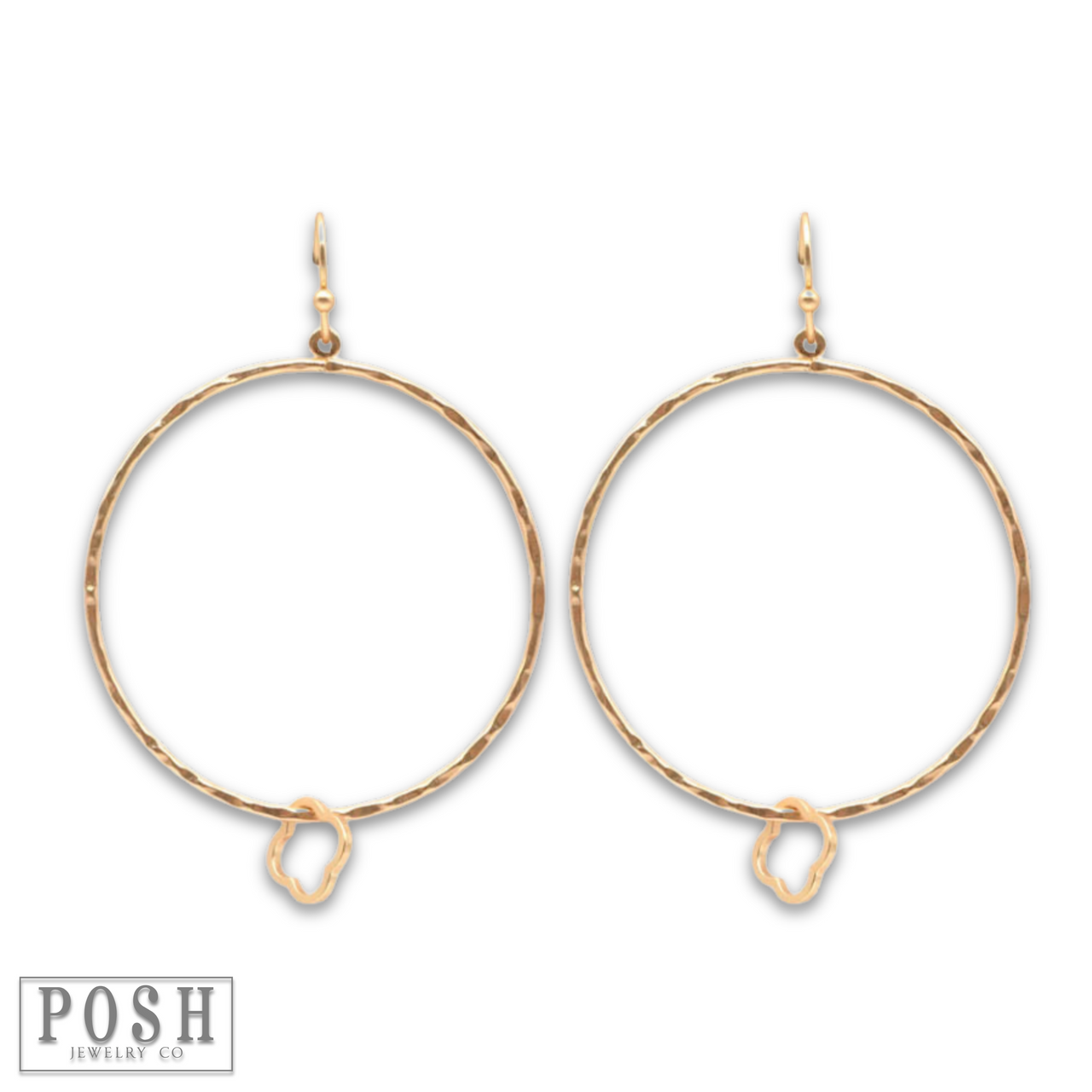 These earrings has a hammered look circle hoop with a floating clover charm.