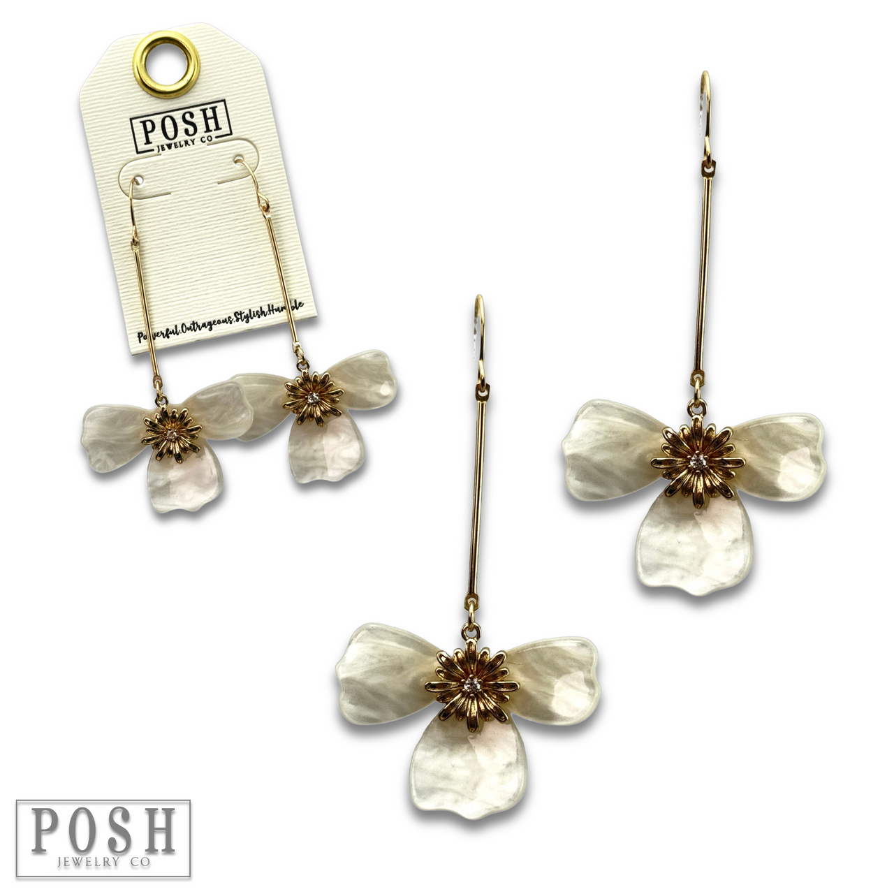 These earings have mother-of-pearl look 3-petal flower charm on a gold tone bar earring.