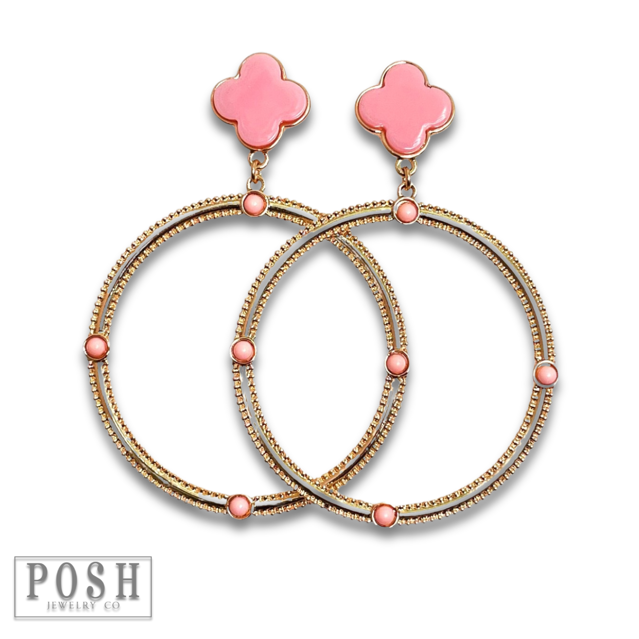 This pink enamel clover post shows off a textured circle earring. The earring is on a post setting.