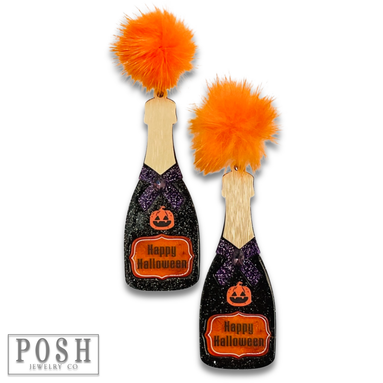These Halloween bottle earrings show off your spooky style!. It hangs from an orange fuzzy pom-pom post setting.