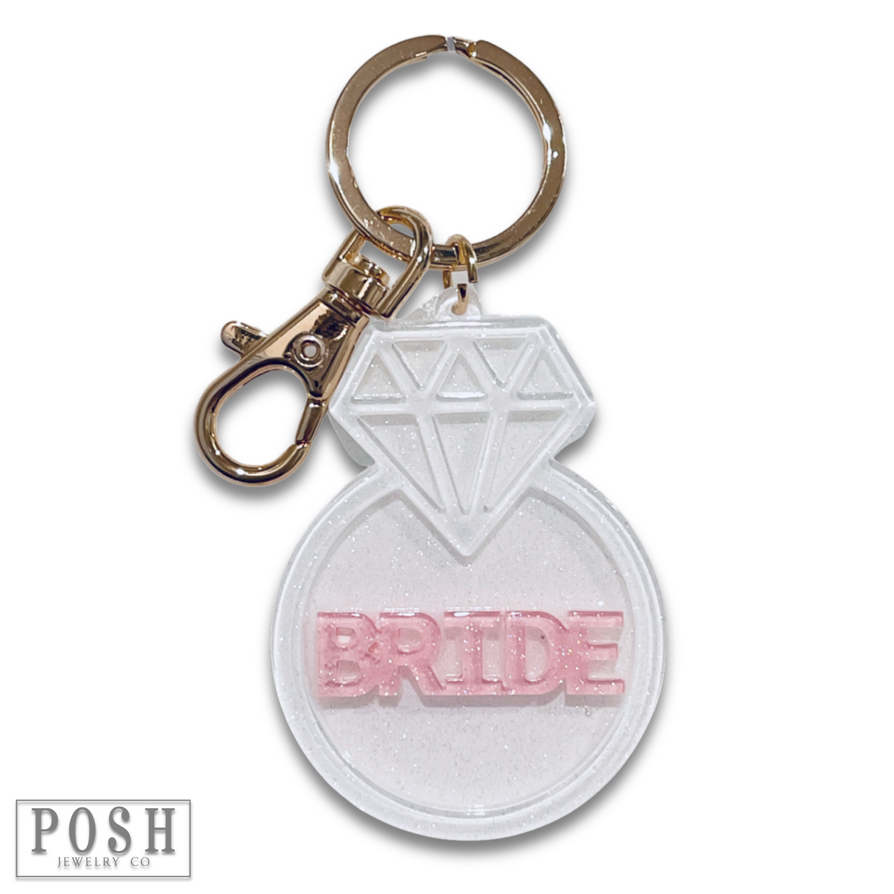 This fabulous keychain, shaped like a sparkling diamond ring, will proudly display either "Bride" or "Bride Squad." Perfect for your keys, bags, luggage, and more! One size fits all.