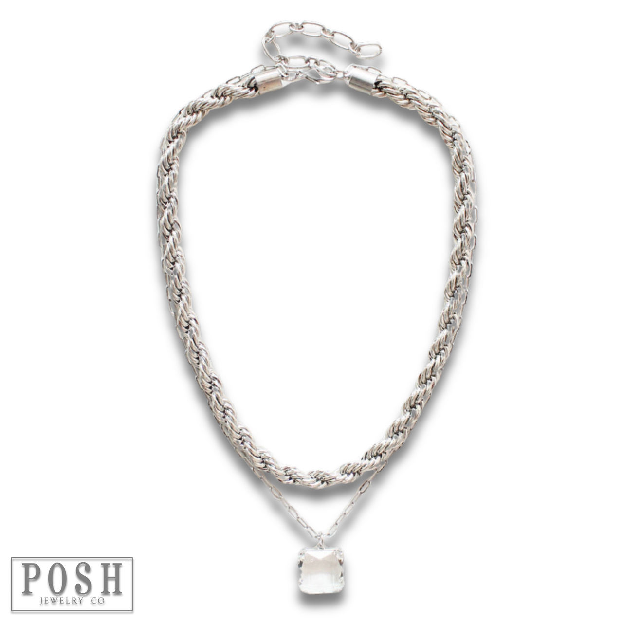 This necklace showcases a silver-toned rope and paperclip chain adorned with a generously sized square clear stone pendant.