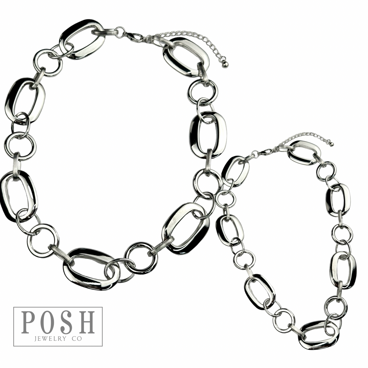 This necklace features chunky, shiny, metal tone chain links of different shapes and sizes.