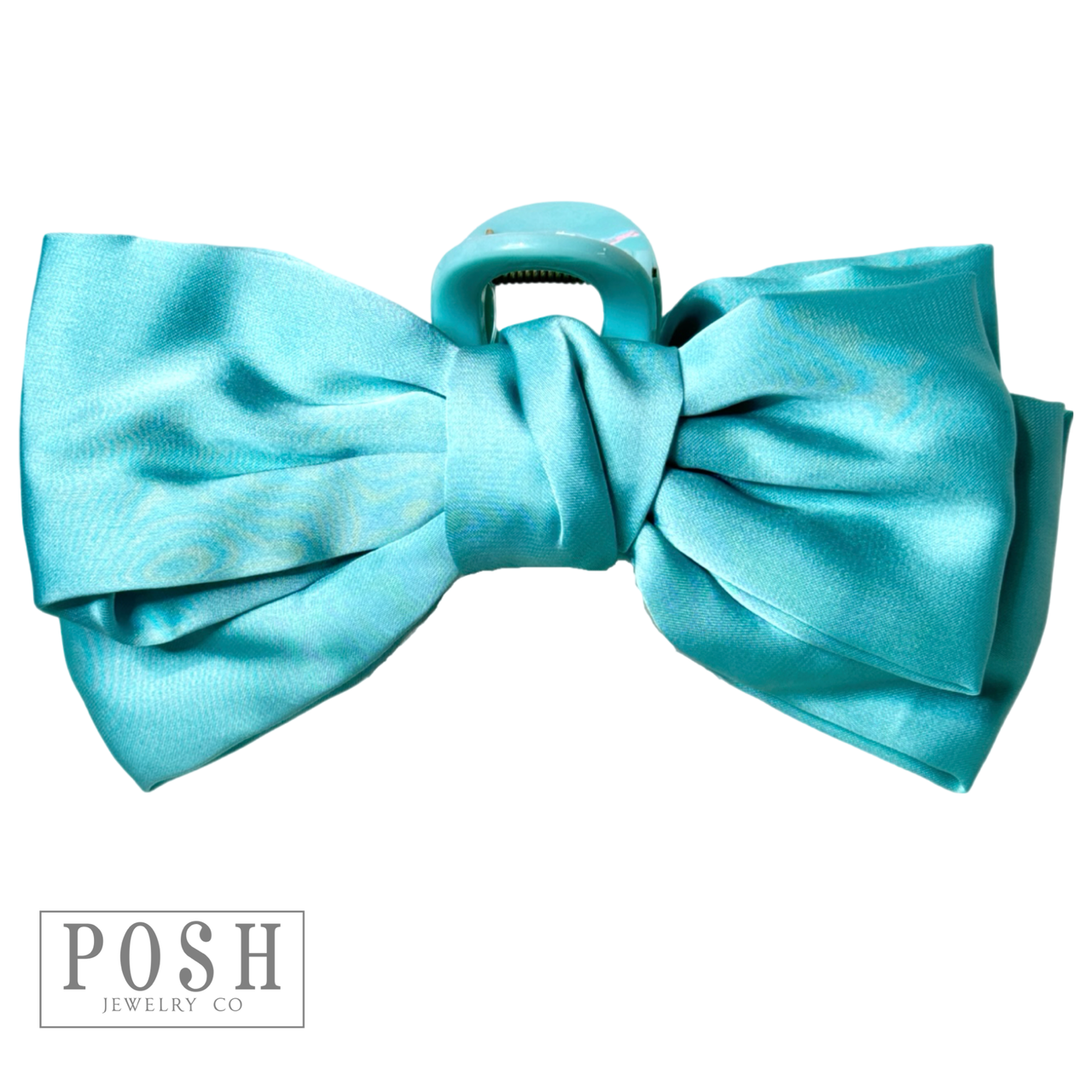 Large bow claw clip for hair. Has a bow on either side of the clip.