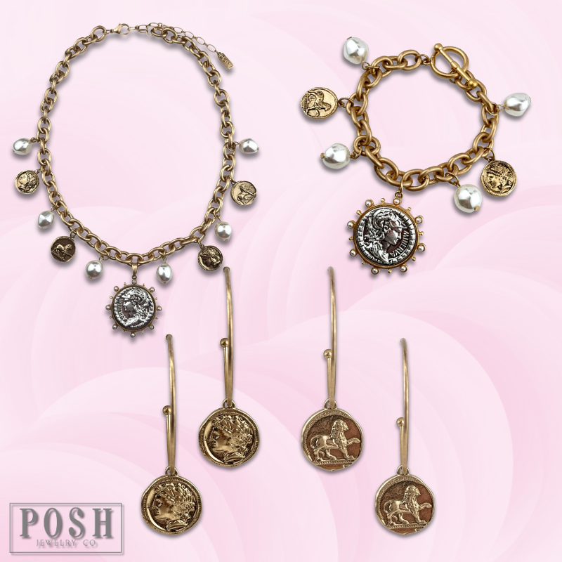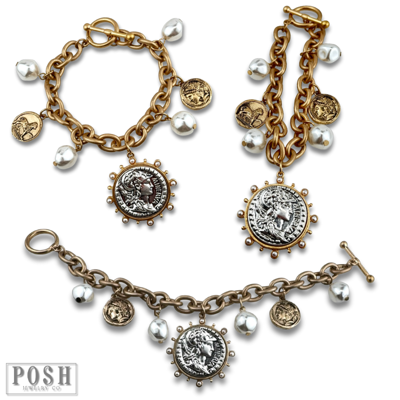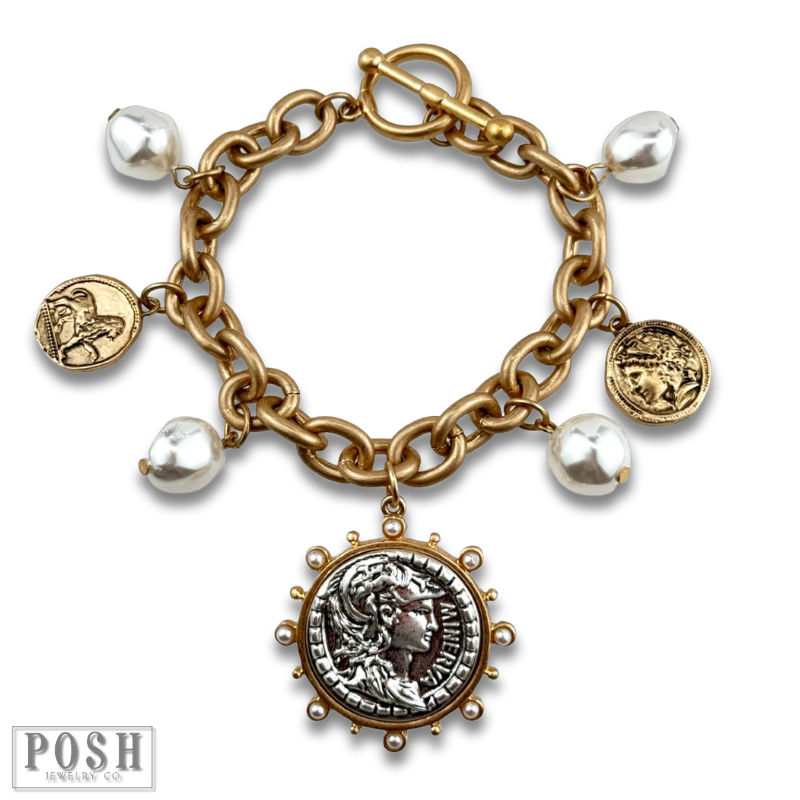 This bracelet has two-sided gold tone coin charms with acrylic pearl beads mixed in. The big charm is a replica of an old world coin in both shiny silver and matte gold tones. The bracelet is a thick link, matte gold tone chain with toggle clasp.