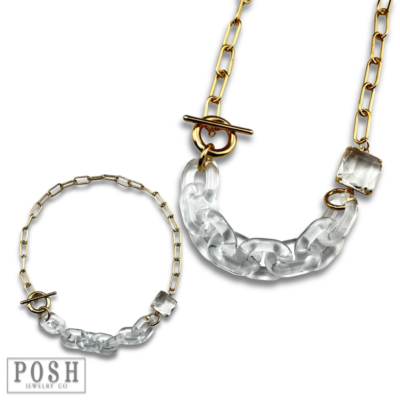 Gold tone and clear chain necklace with functional toggle and large square clear stone feature.