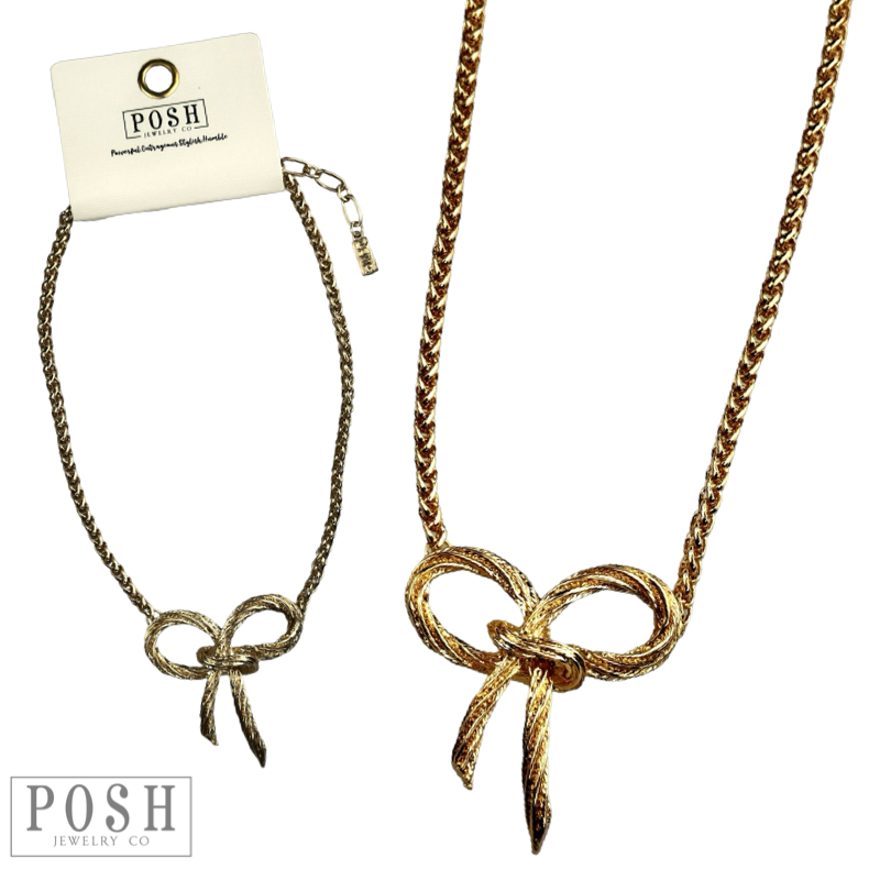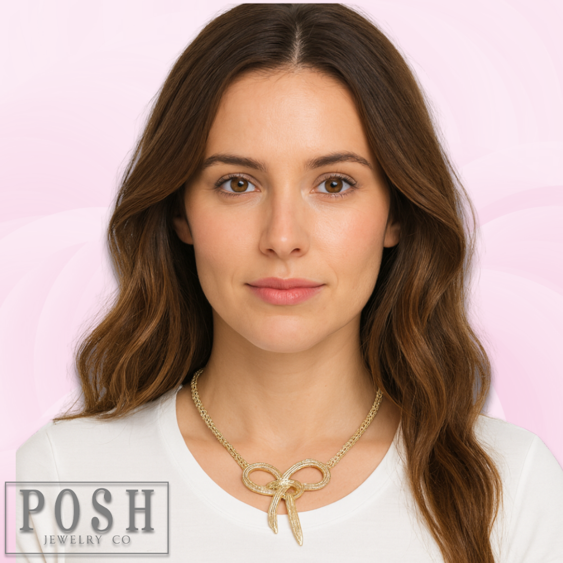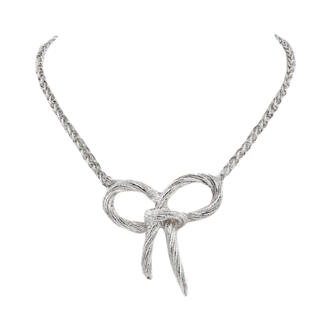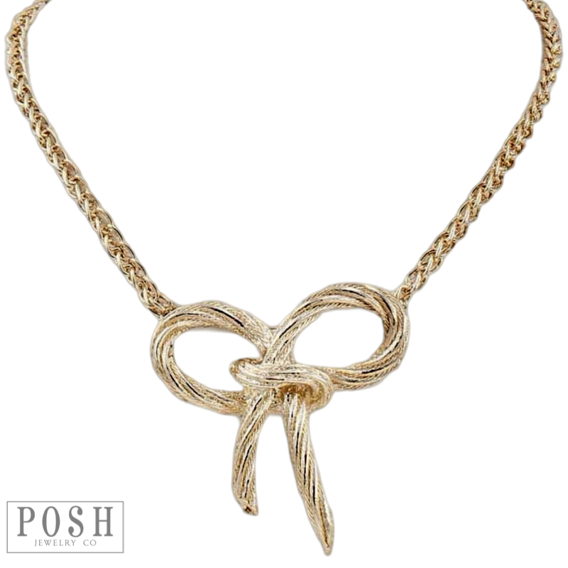 A large infinity bow with visible texture hangs from a wheat chain (also known as a Spiga chain). The wheat chain has four twisted over links for a unique look.