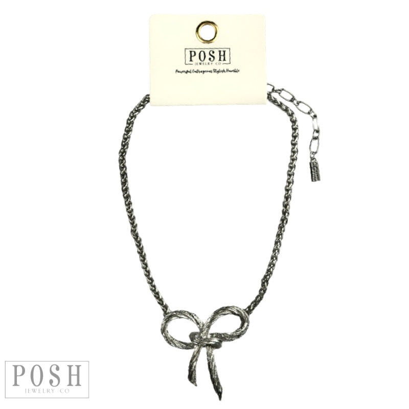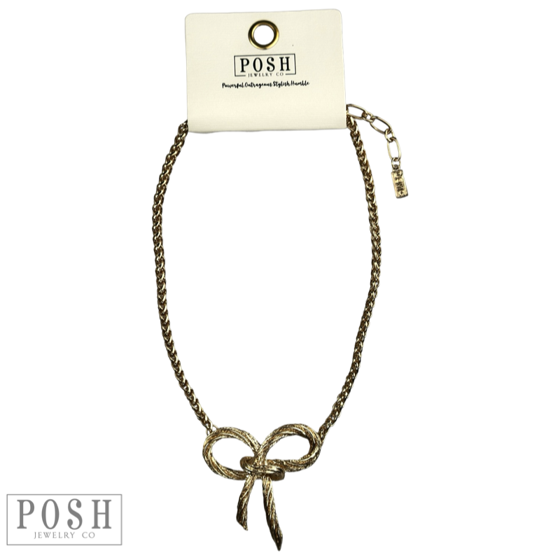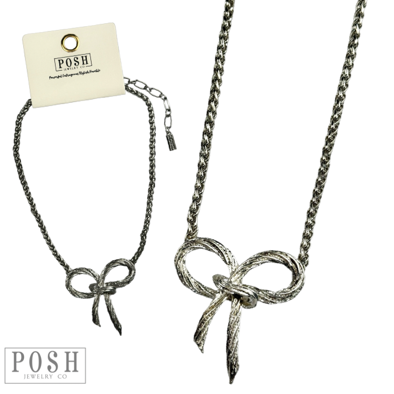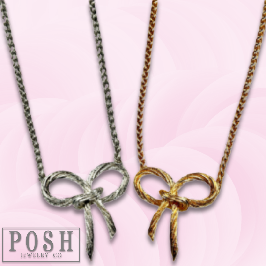 A large infinity bow with visible texture hangs from a wheat chain (also known as a Spiga chain). The wheat chain has four twisted over links for a unique look.