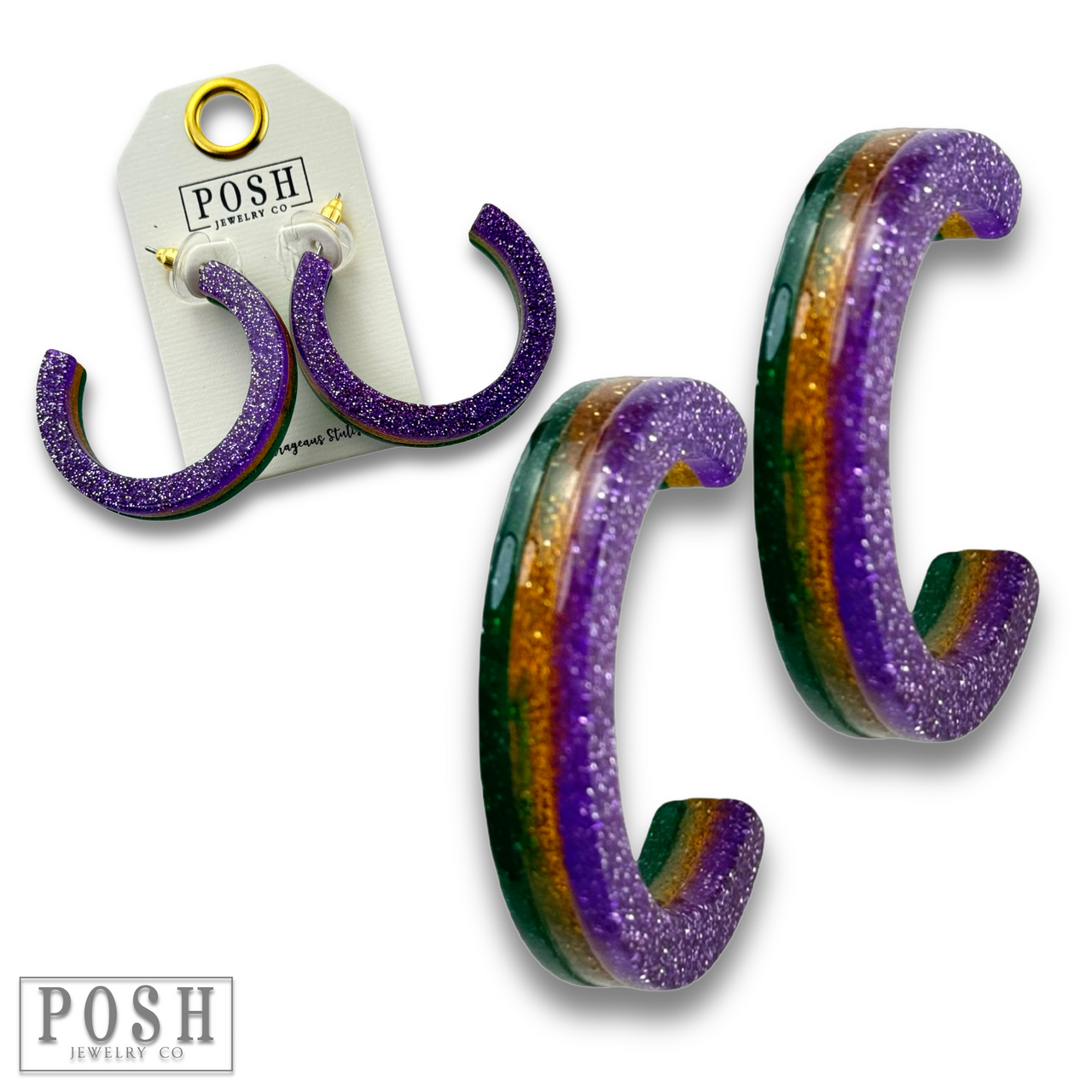 Mardi Gras hoop earring has glitter and has the three primary Mardi Gras colors.