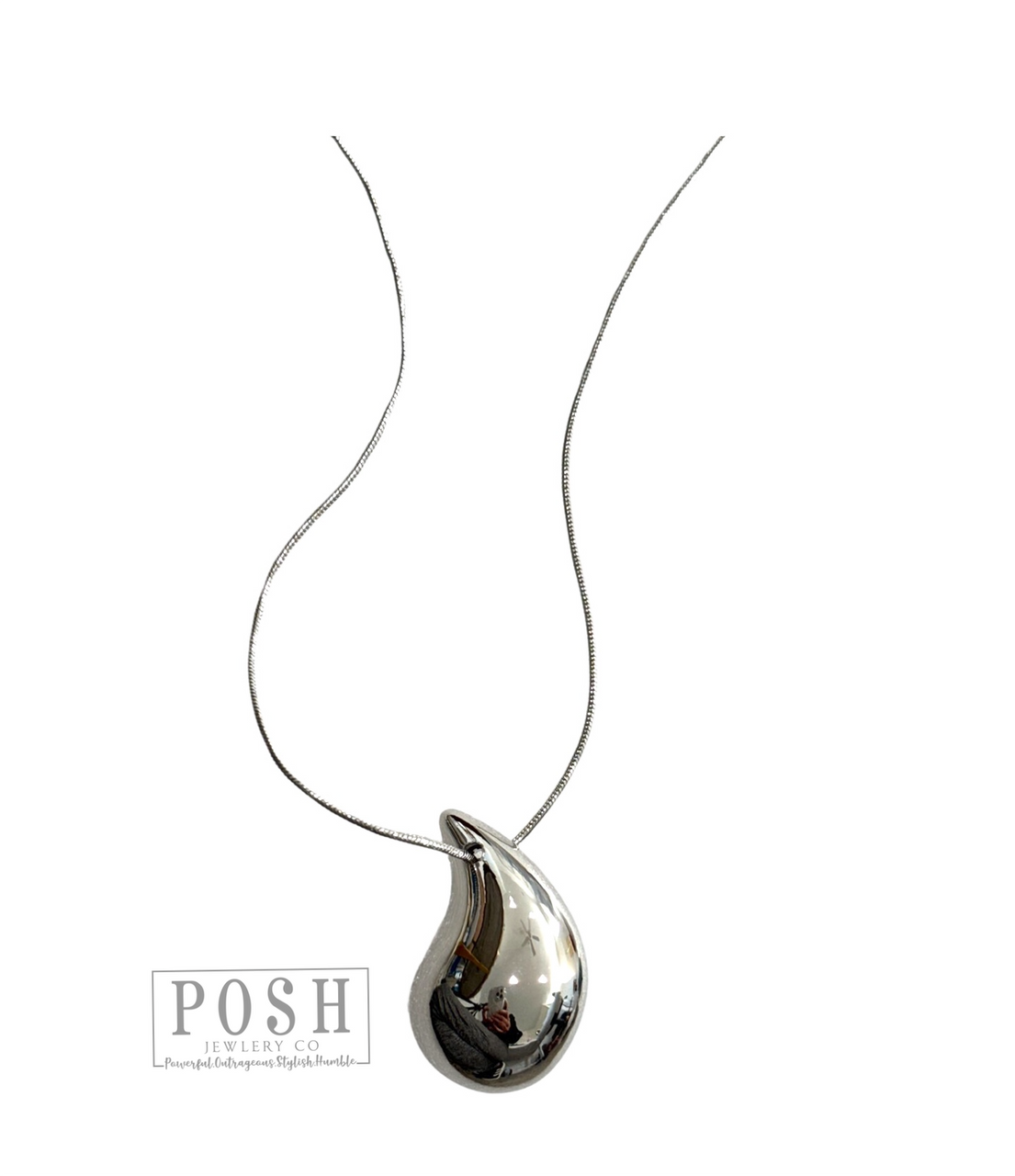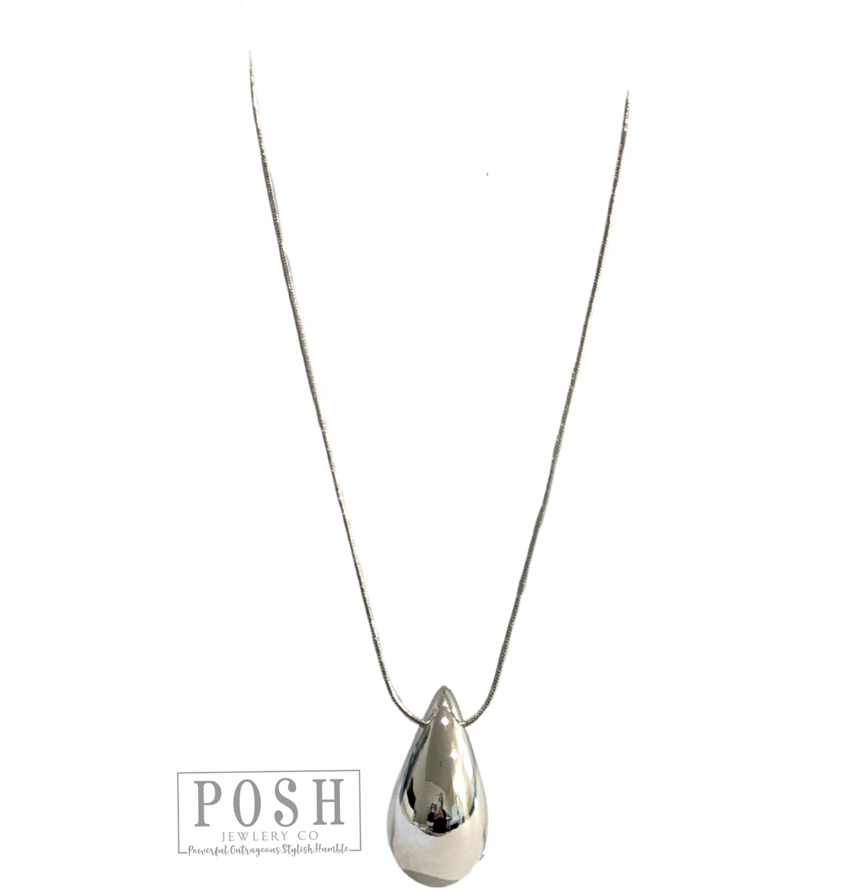 Thin round snake chain necklace has a light weight metal coated acrylic raindrop pendant.
