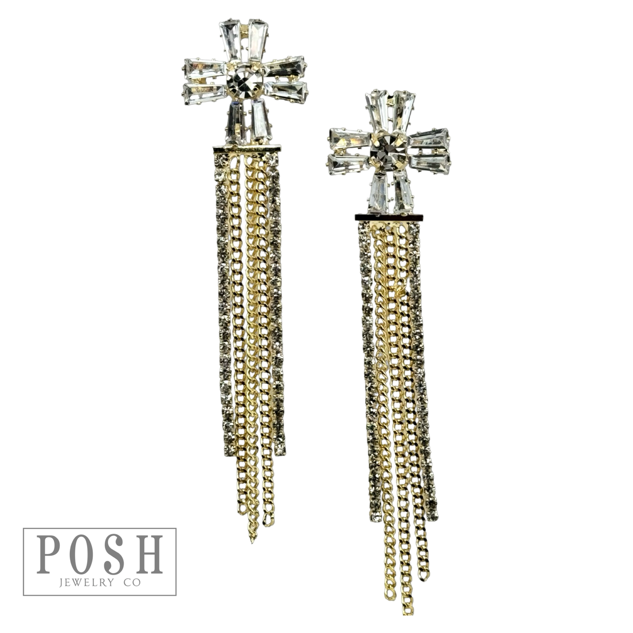 These earrings have a cross with rectangle shaped rhinestones. It also has rhinestone and metal tone chain fringe hanging from it. Post setting and is approximately 3 inches in length.