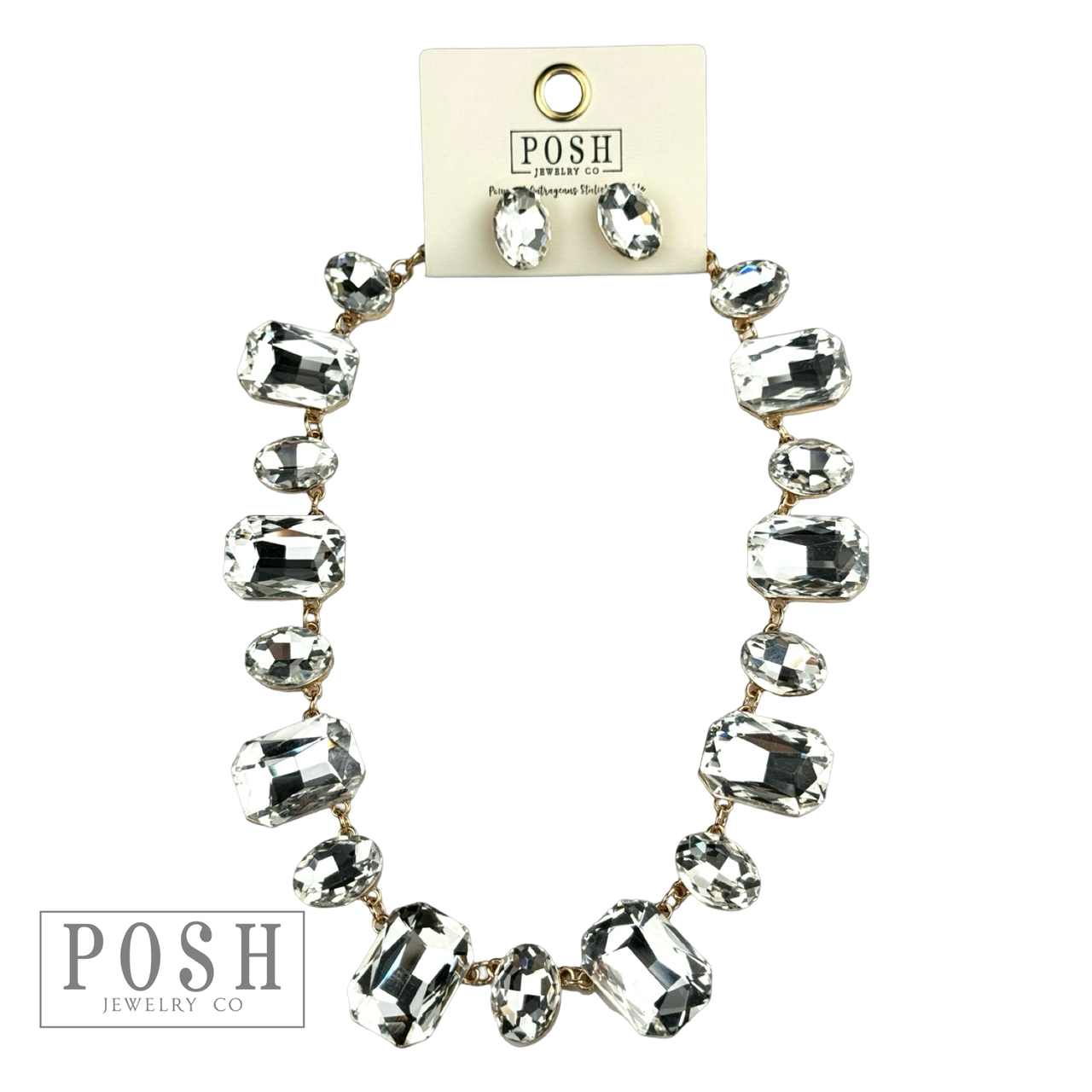 This set has a necklace with large rectangle and small oval rhinestones in a gold tone linked setting. The set includes a pair of oval rhinestone post earrings that coordinates with the necklace.