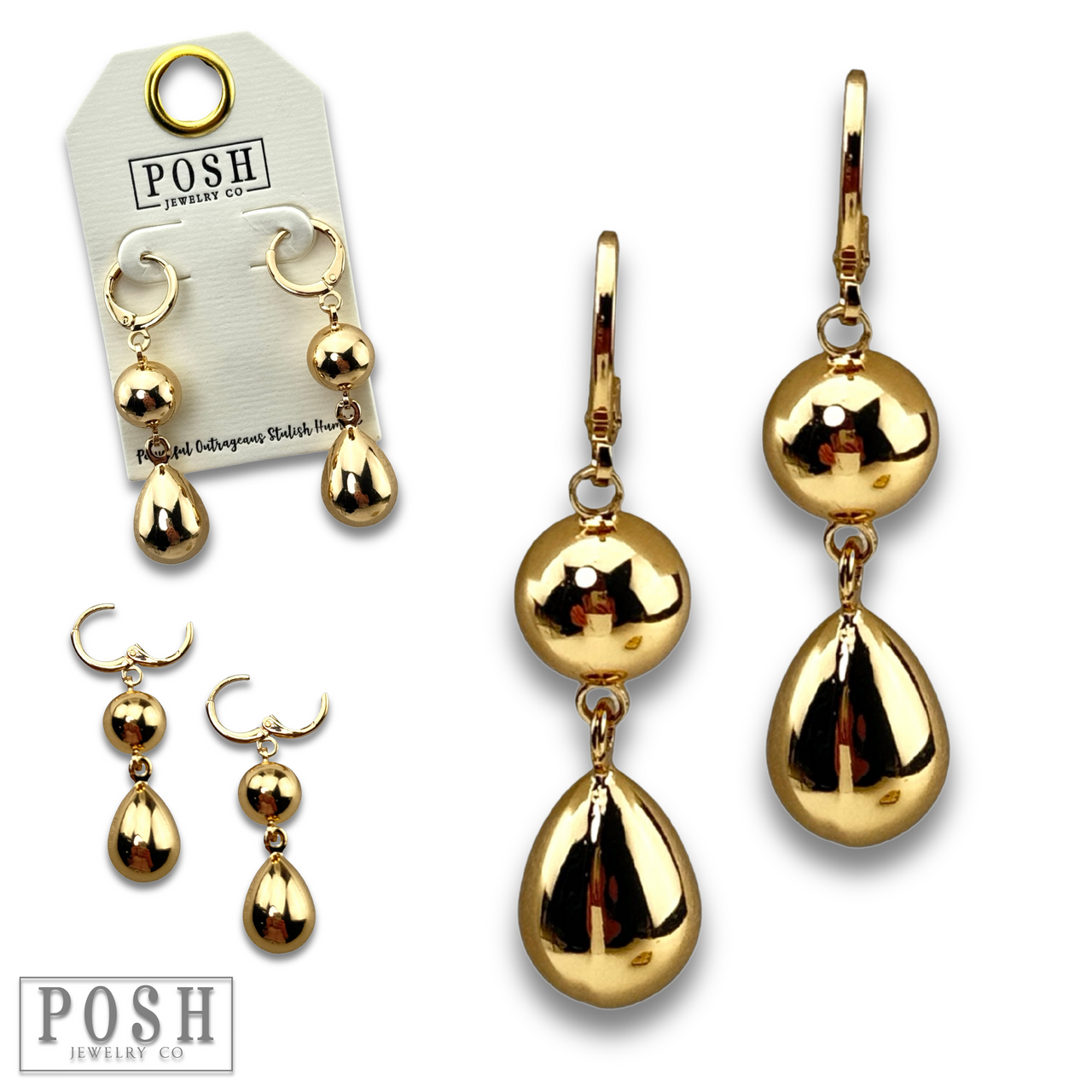 This earring features one round and one teardrop bead with shiny finish on a lever back setting. Approximately 1.75 inches in length.