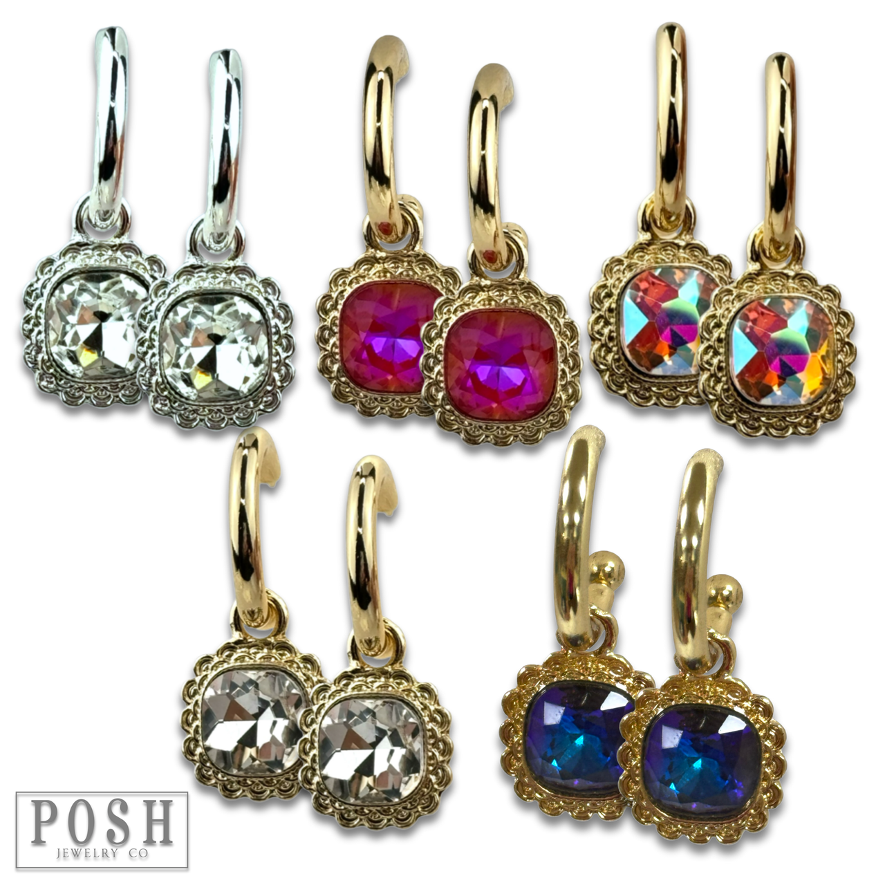This hoop earring has a square rhinestone in a scalloped metal tone setting. The hoop has a post setting.