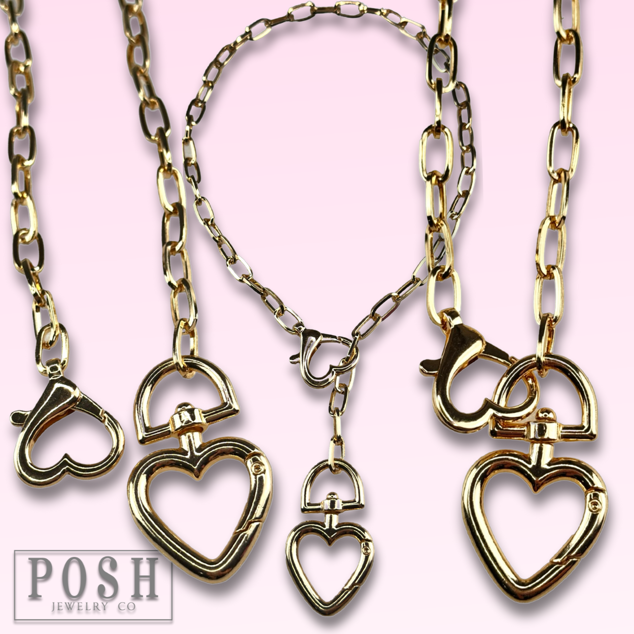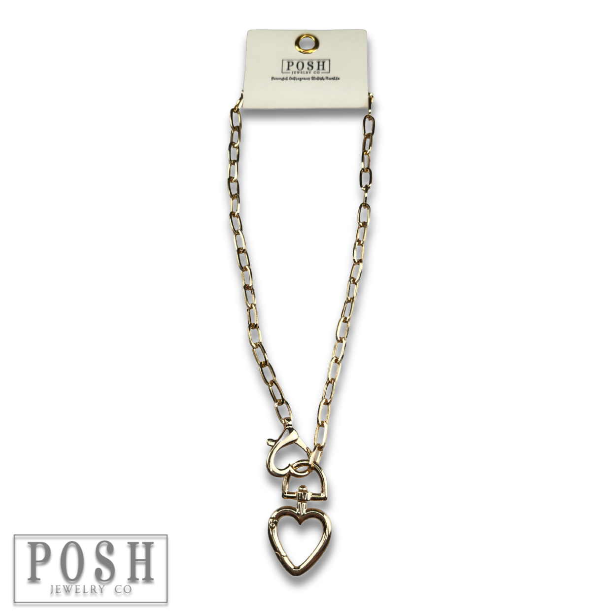 This gold tone link chain necklace has an open swivel hook heart pendant.  The pendant acutally opens if you want to add something special to it.  The clasp is also a heart and can clip on anywhere you choose.  It's 18 inches from clasp to the half circle swivel hook.