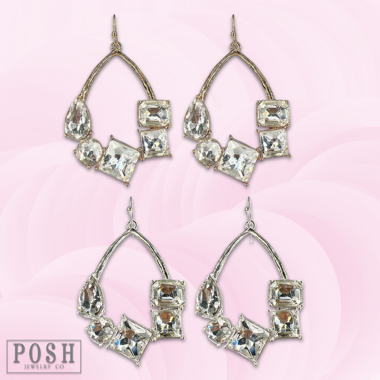 Get ready to dazzle with these silver colored teardrop earrings showcasing an array of sparkling rhinestone shapes!