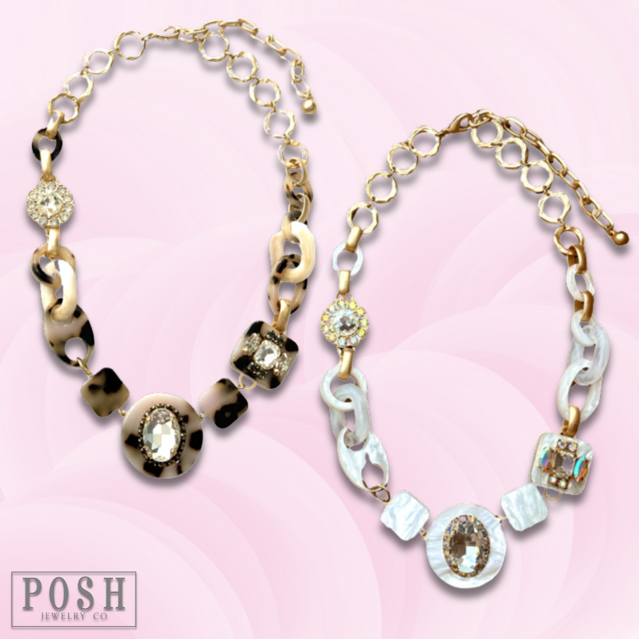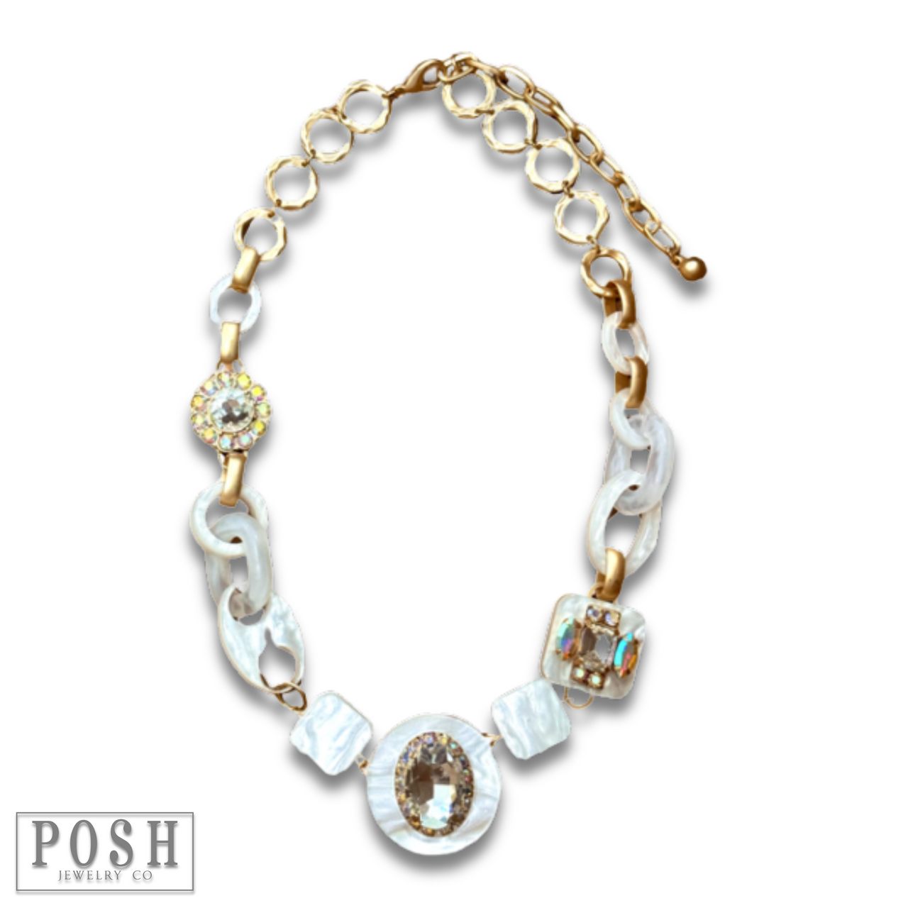 This playful necklace features an array of acrylic shapes and sparkling rhinestone charms, adding a touch of fun to any outfit.