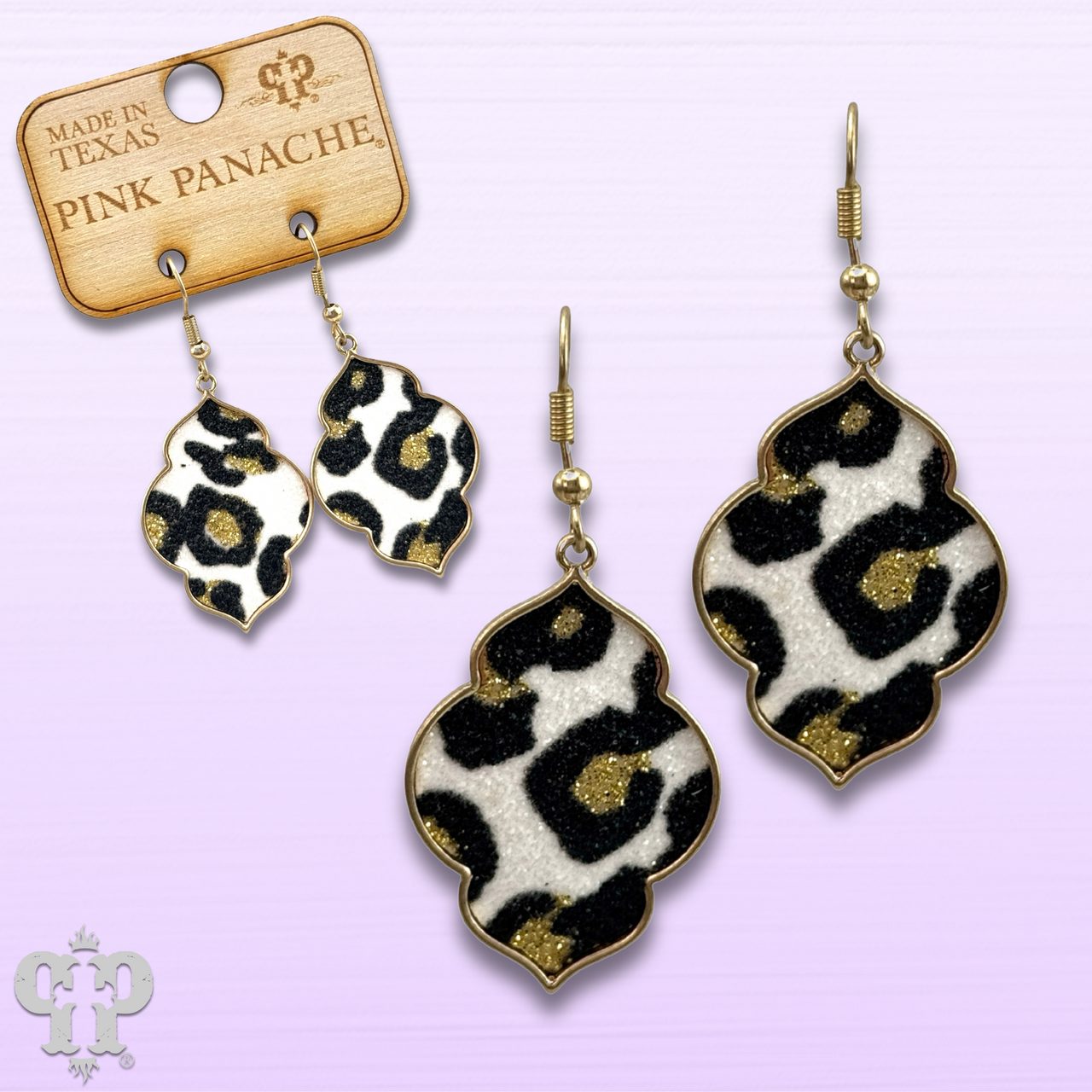 These quatrefoil shape earrings have a white glitter leopard inlay.