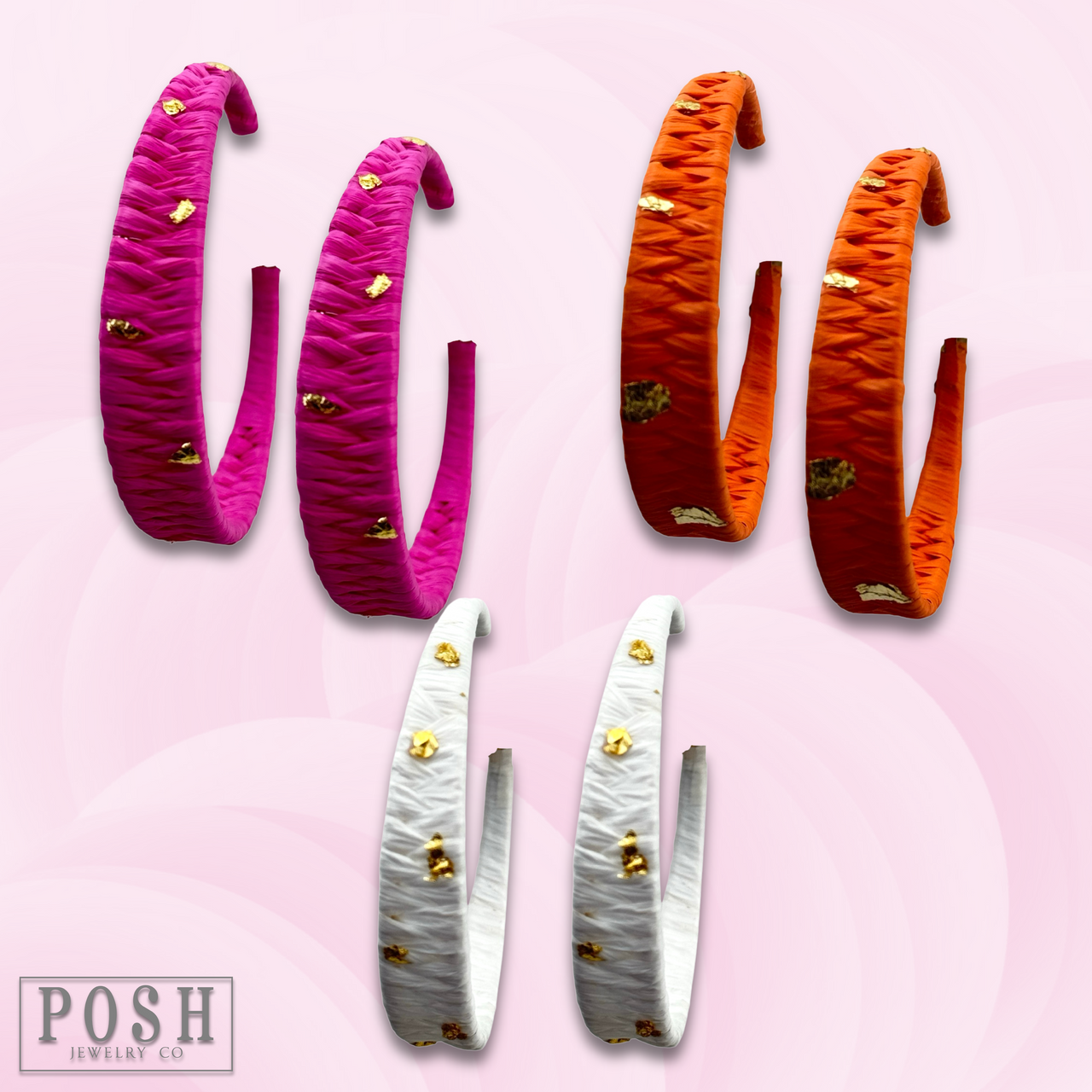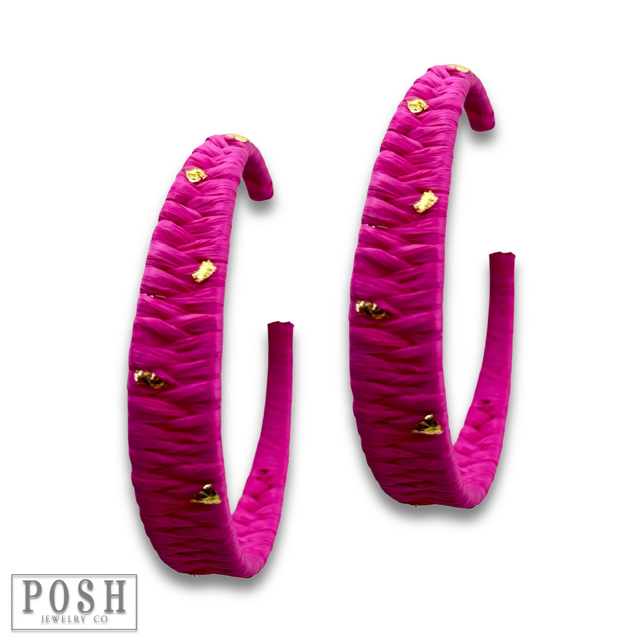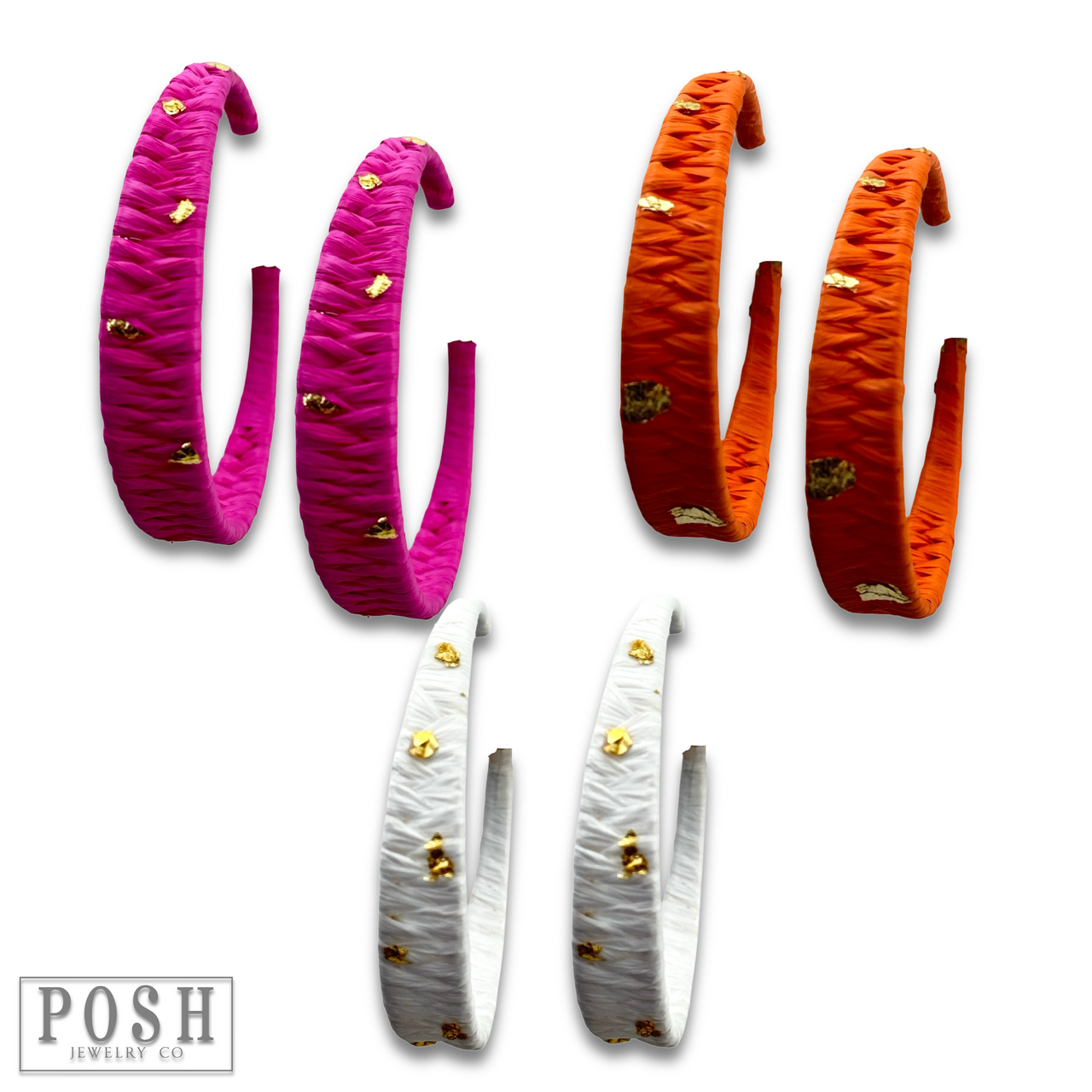 These playful hoop earrings are woven with raffia and sprinkled with gold flecks.