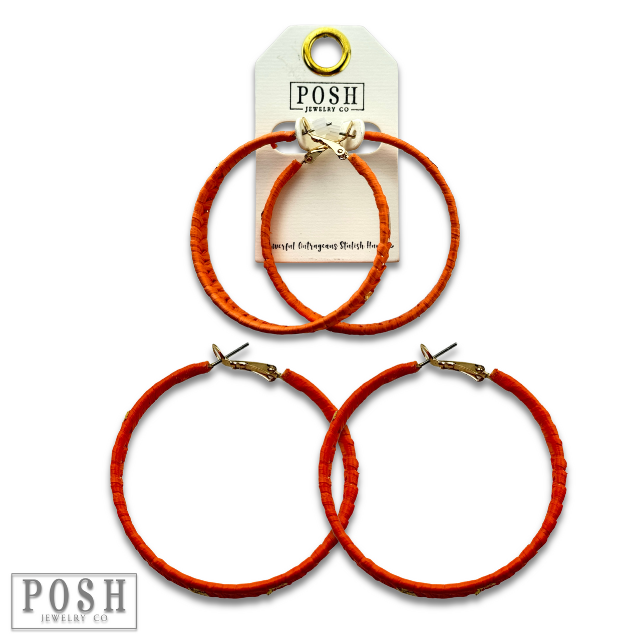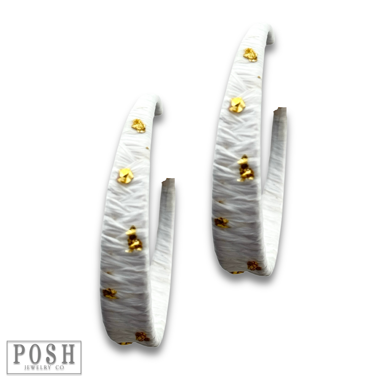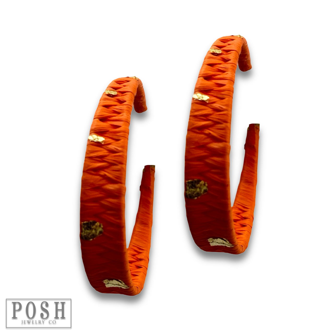 These playful hoop earrings are woven with raffia and sprinkled with gold flecks.