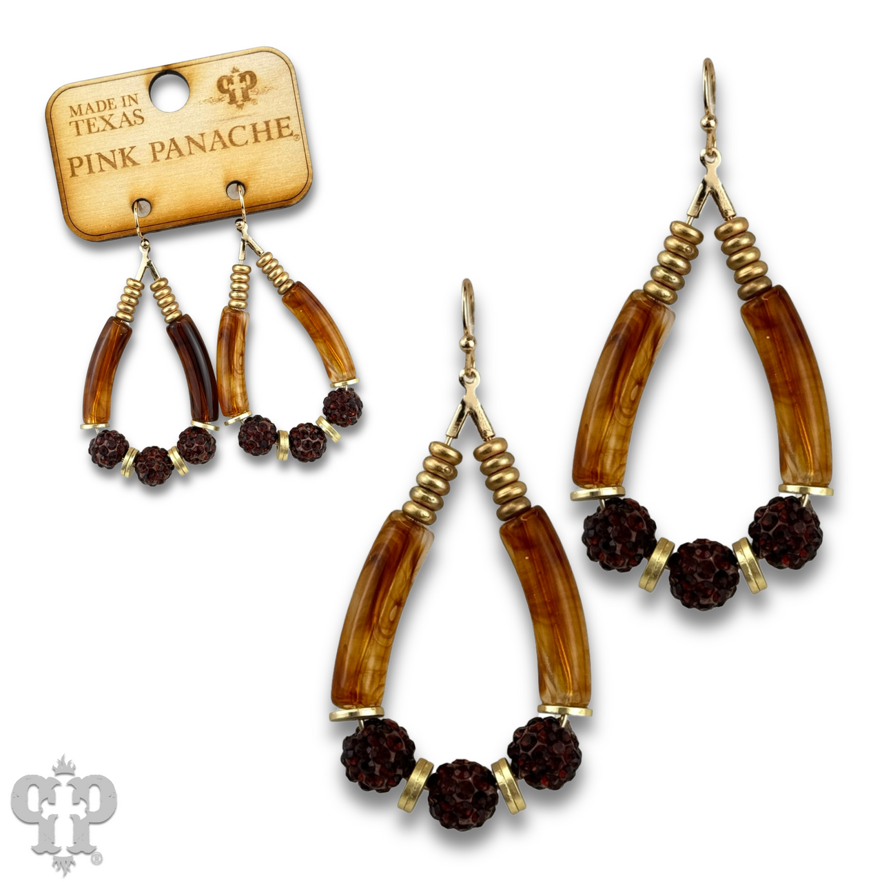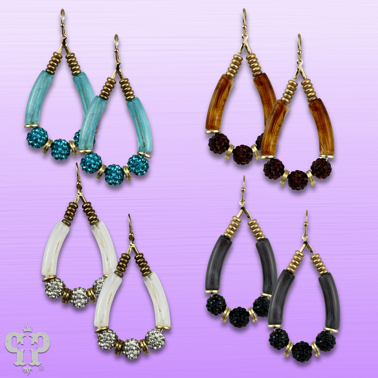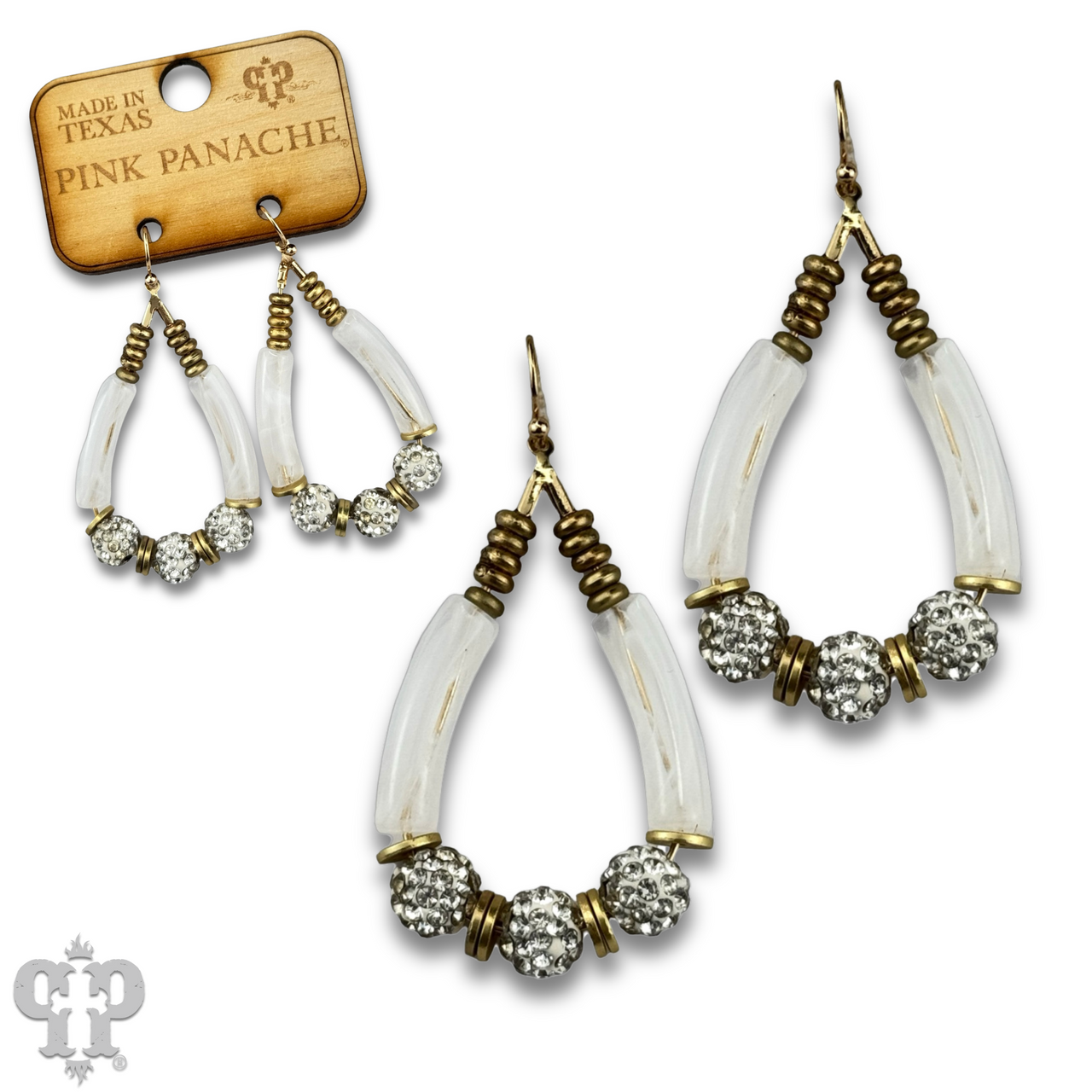 These teardroop shape earrings have a fashionable mix of bamboo tube, rhinestone pave and gold tone disc beads.