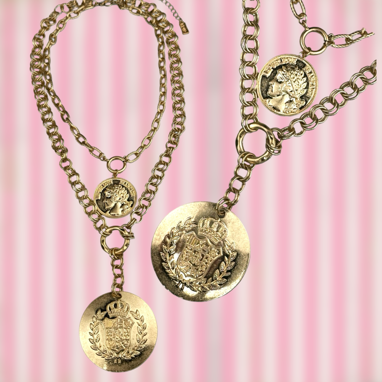 This two strand necklace has gold tone chain of different shapes and textures.  It features two royal coin pendants.