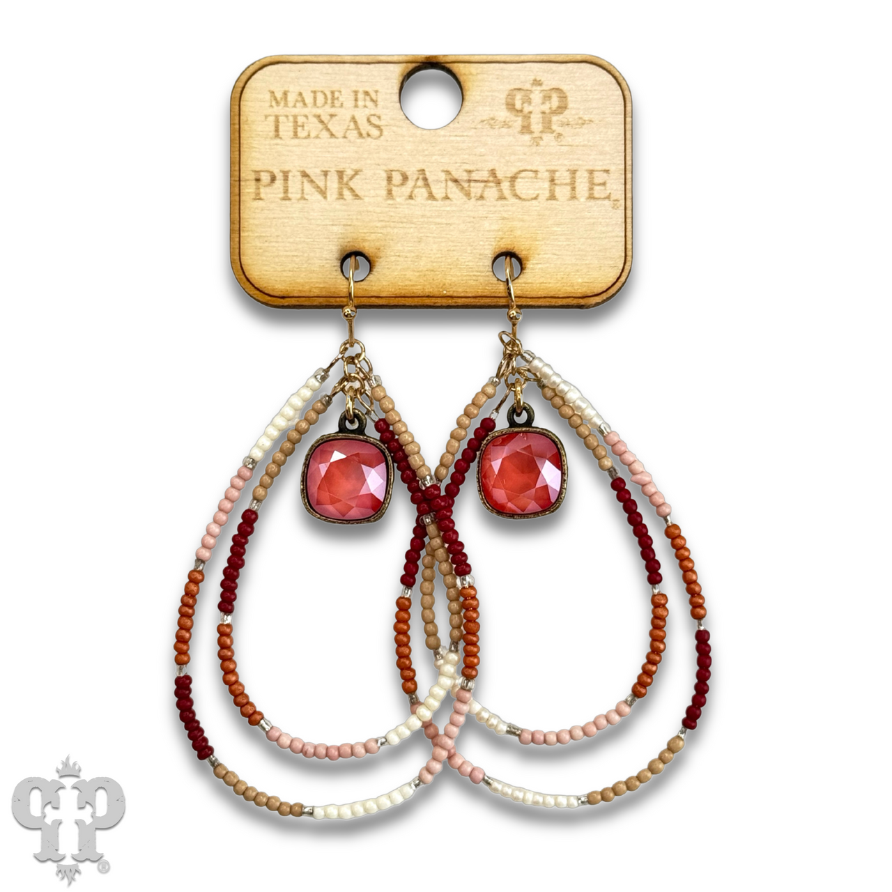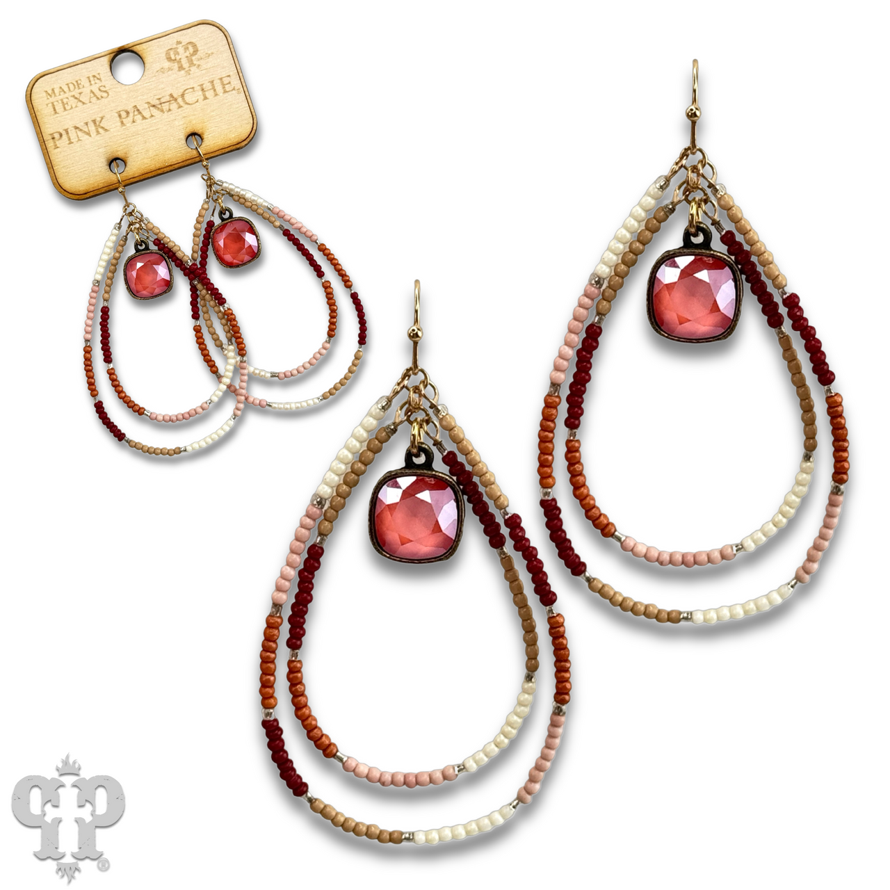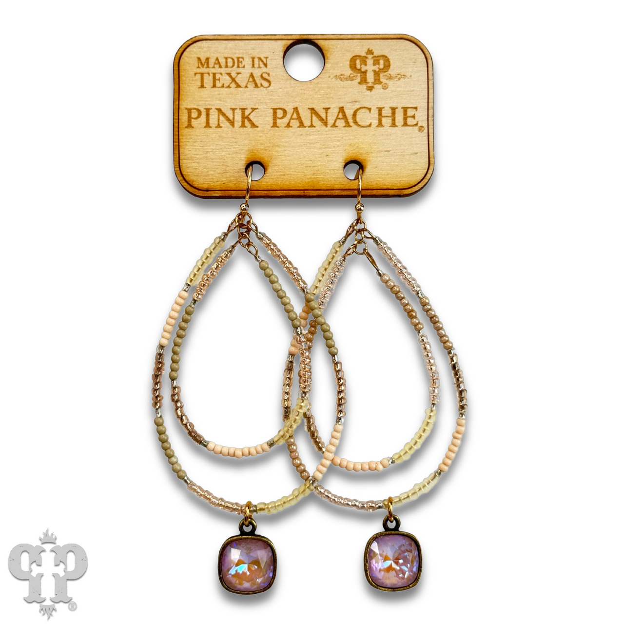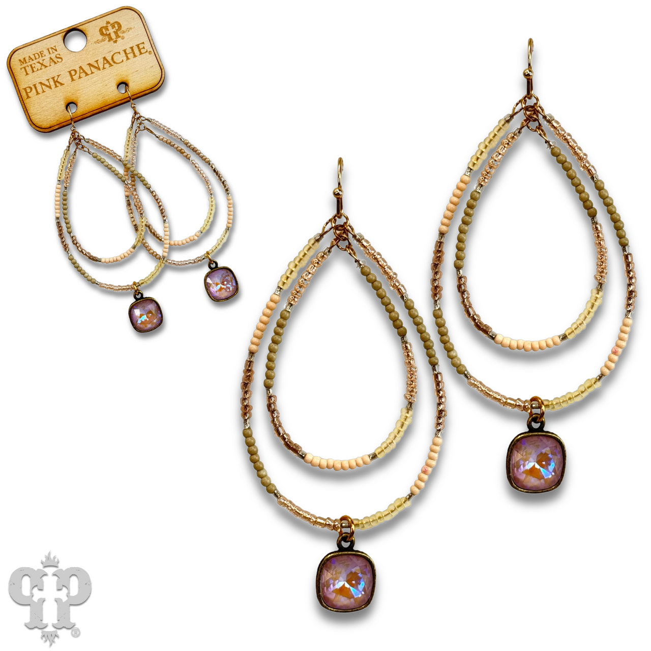 These earrings have double teardrops with different color seed beads. They either hang from an Austrian crystal or have one hanging from the bottom.