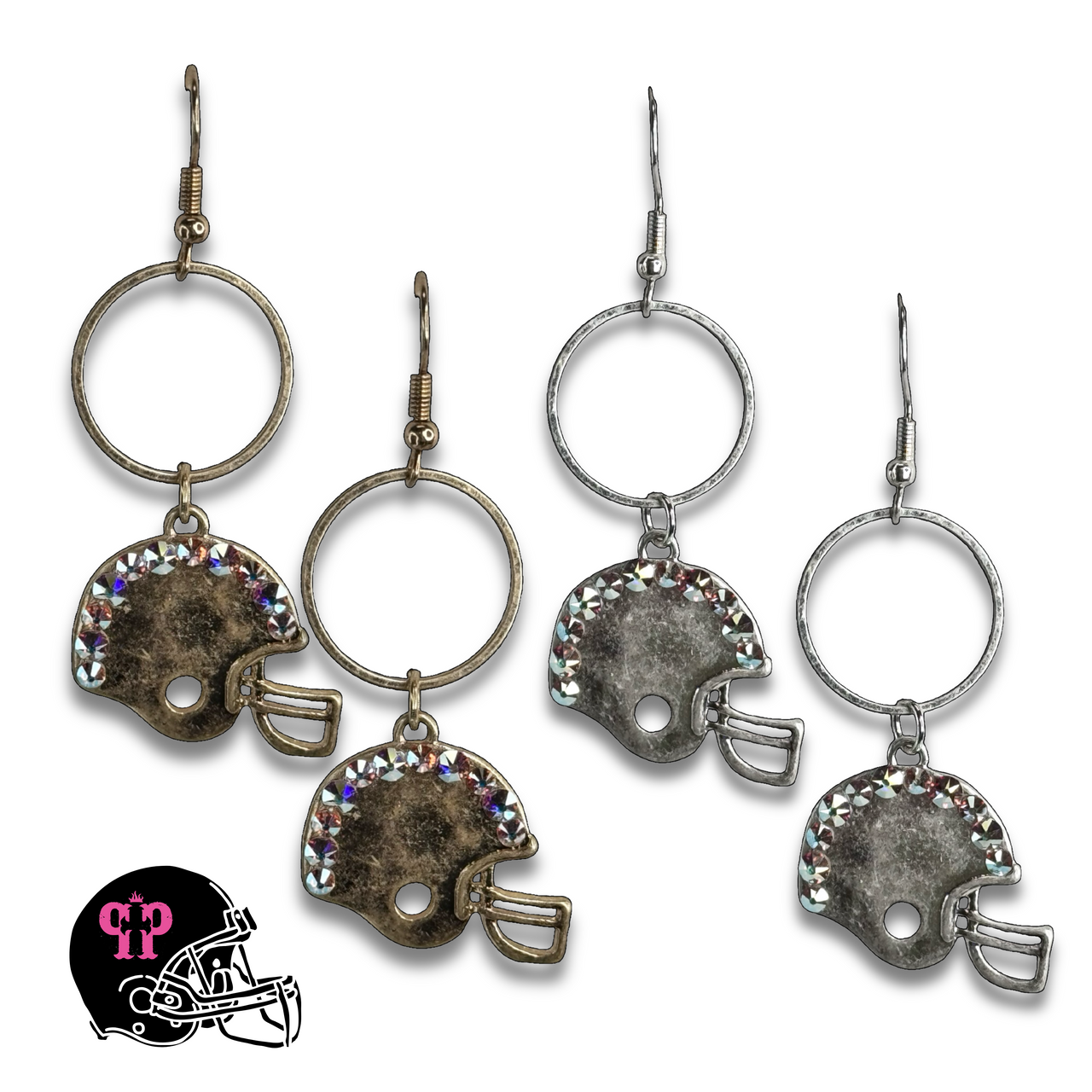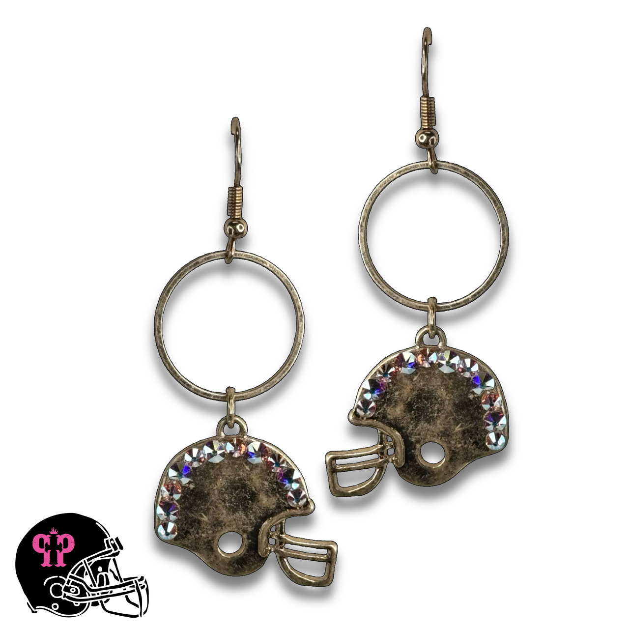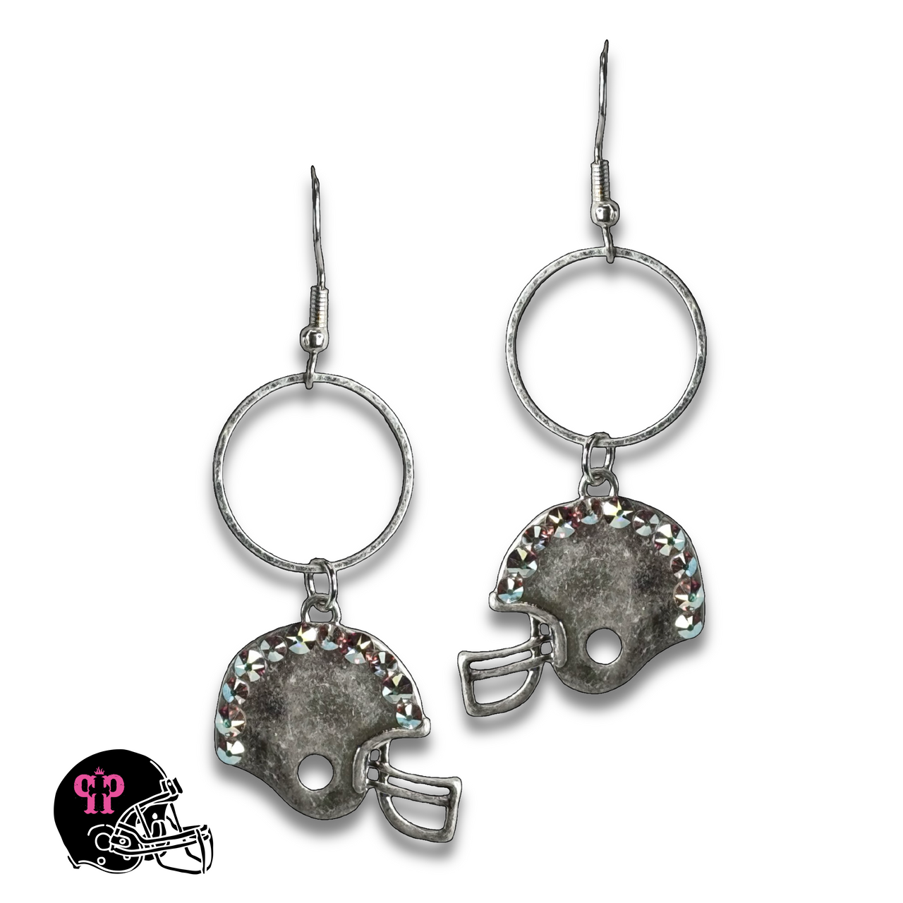 This earring, in the shape of a football helmet, is in a matte metal tone finish with hand set iridescent (AB) Austrian crystals.  The earrings hang from a circle charm and fish hook.